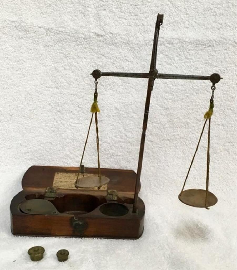 True set of Gold rush portable Gold Scales. When set up 9" tall x 8" wide. Est:$100-200