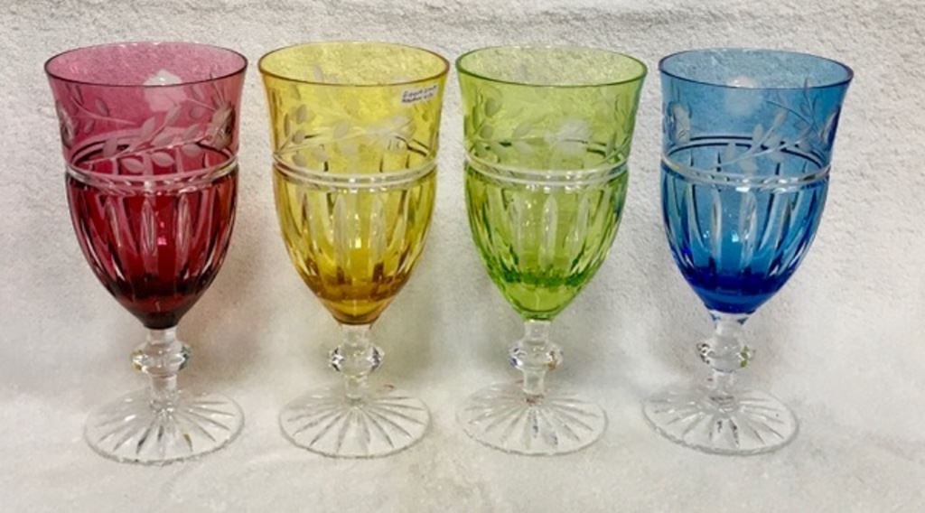 4 intaglio cut colored to clear stemmed goblets signed Hawkes. Circa 1890s. 71/2 tall. Est.:$200-$400.