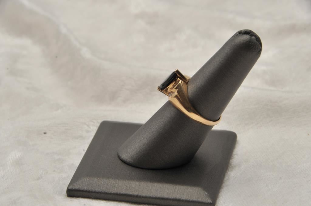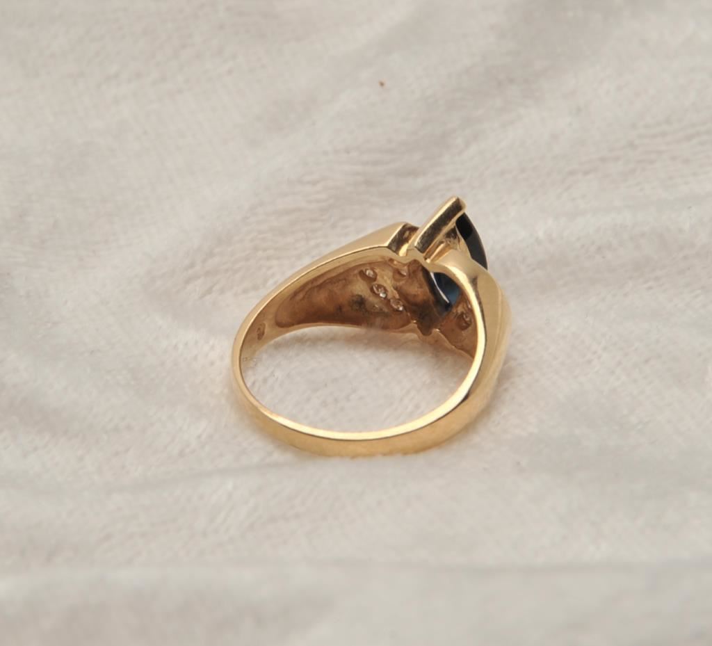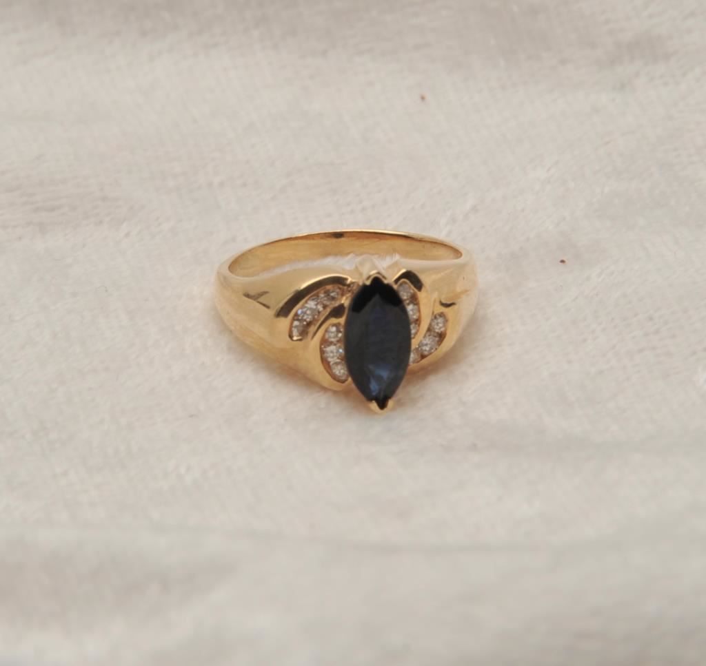 One ladies ring in 14k yellow gold set with a marquee sapphire approx 1.5ct and 12 side diamonds Est:$225-550