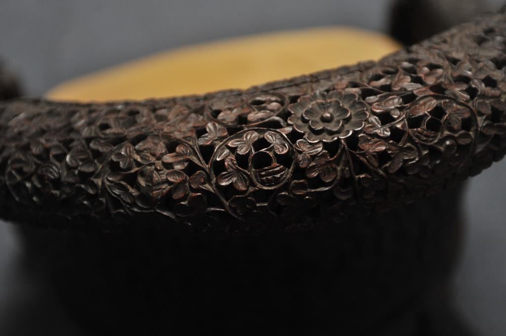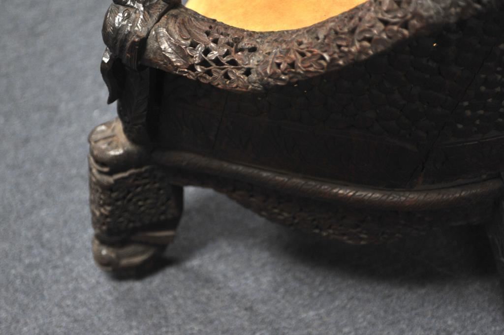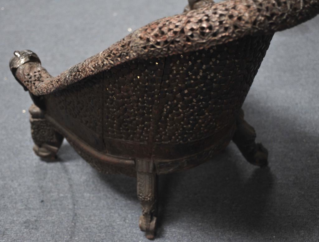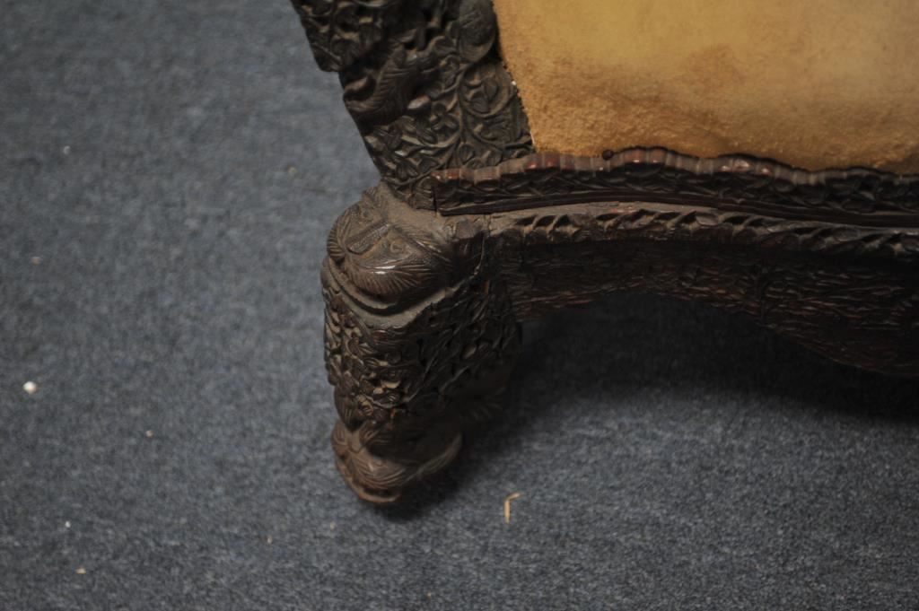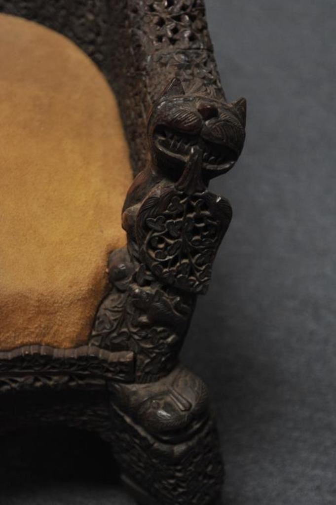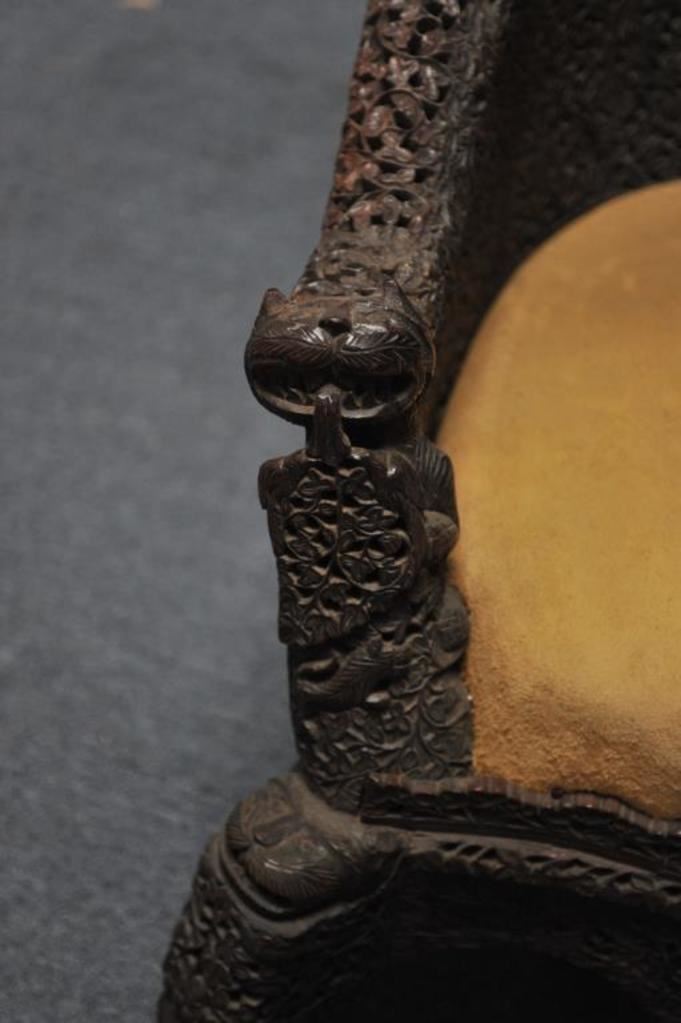 Carved teakwood chair from the Zane Gray estate. Has his mark and signed statement as to provenance. Circa 1900-1920. Heavy and well carved. Est. $750-1500