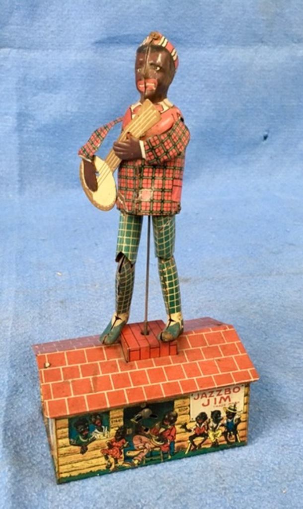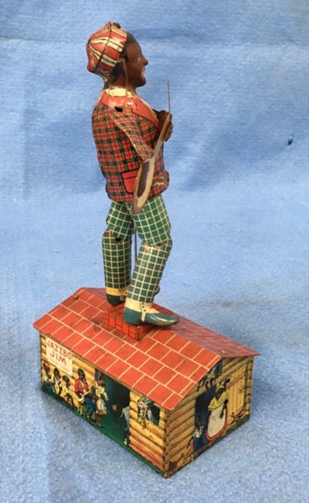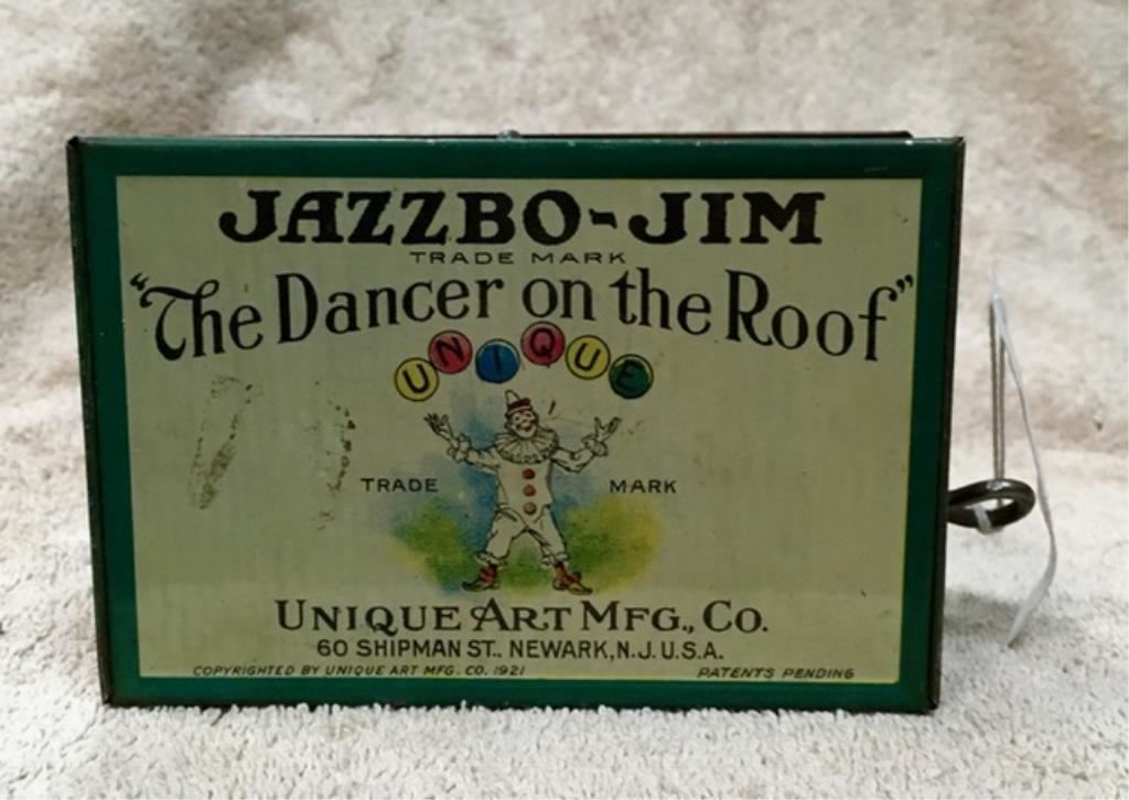 Jazzbo Jim clockworks tin " The Dancer on the Roof" manufactured by Antique Art MFG. 6 Newark NJ Circa 1921 9 1/2" tall. Est.:$500-$1,000.