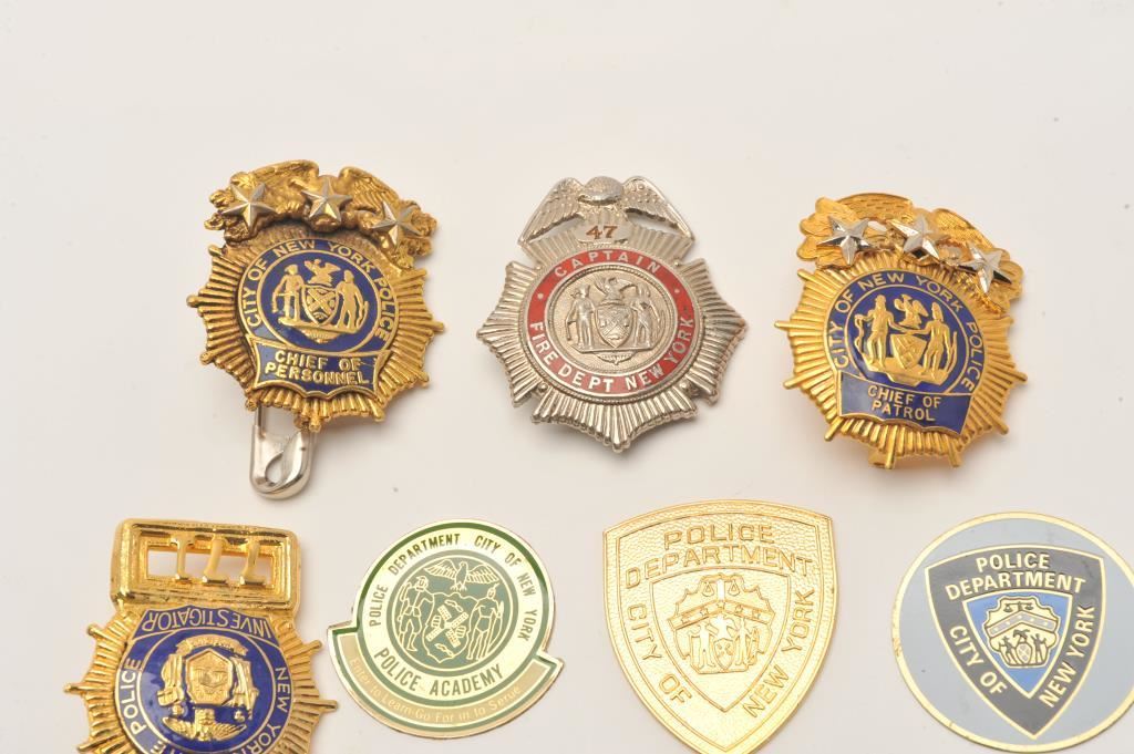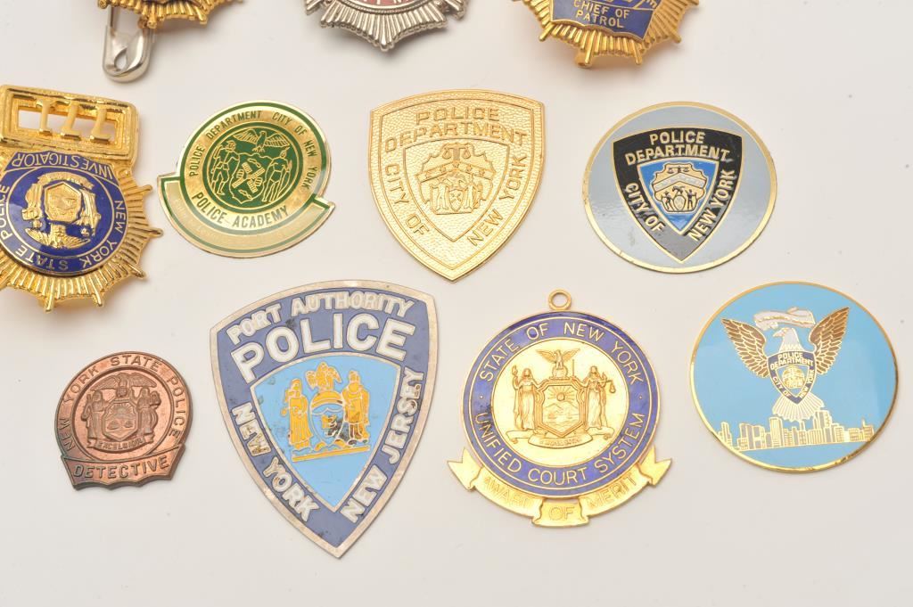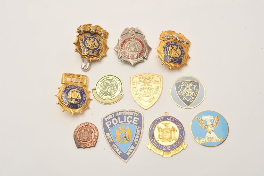 Lot of misc. badges and small plaques including 3 cap badges (2 City of new York Police: Chief of Personnel and Chief of Patrol and one New York State Police Investigator (771/hallmark Sherry N.Y.); a Fire Department New York Captain badge plus smalls including a Port Authority Police New York/New Jersey insignia plaque, a New York State Police Detective insignia plaque, a State of New York Unified Court System Award of Merit and more. Est.: $250-$500.