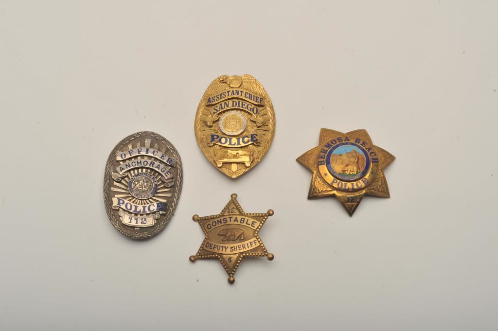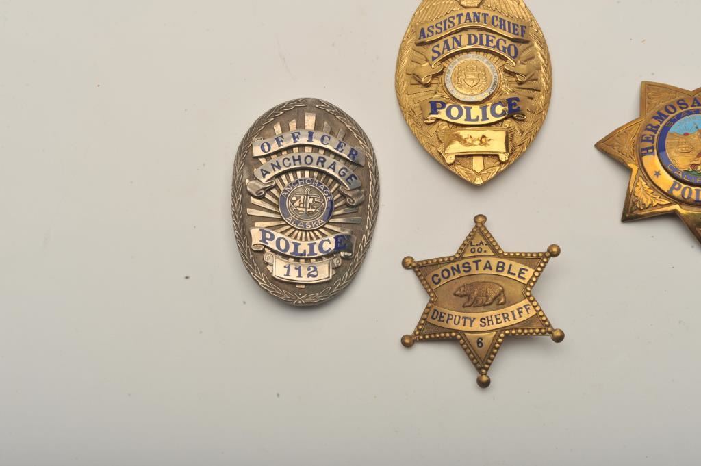 Lot of 4 badges including an Assistant Chief San Diego (Calif.) Police pin shield badge (hallmark LA Stamp & Staty Co.), a Hermosa Beach, Calif. 7-point pin star badge #12, a 6-point pin star badge marked L.A. Co. Constable Deputy Sheriff, #6 and an Anchorage (Alaska) Police Officer pin shield badge, #112 (hallmark Sun Badge Co./L.A. County). Est.: $150-$300.