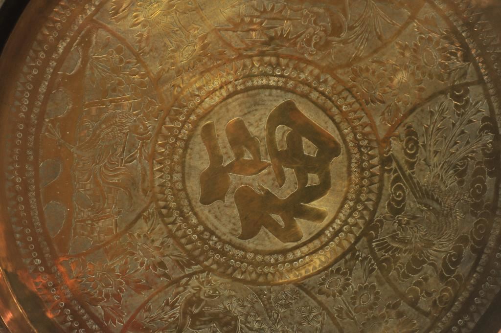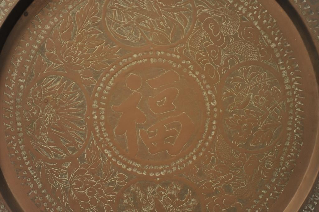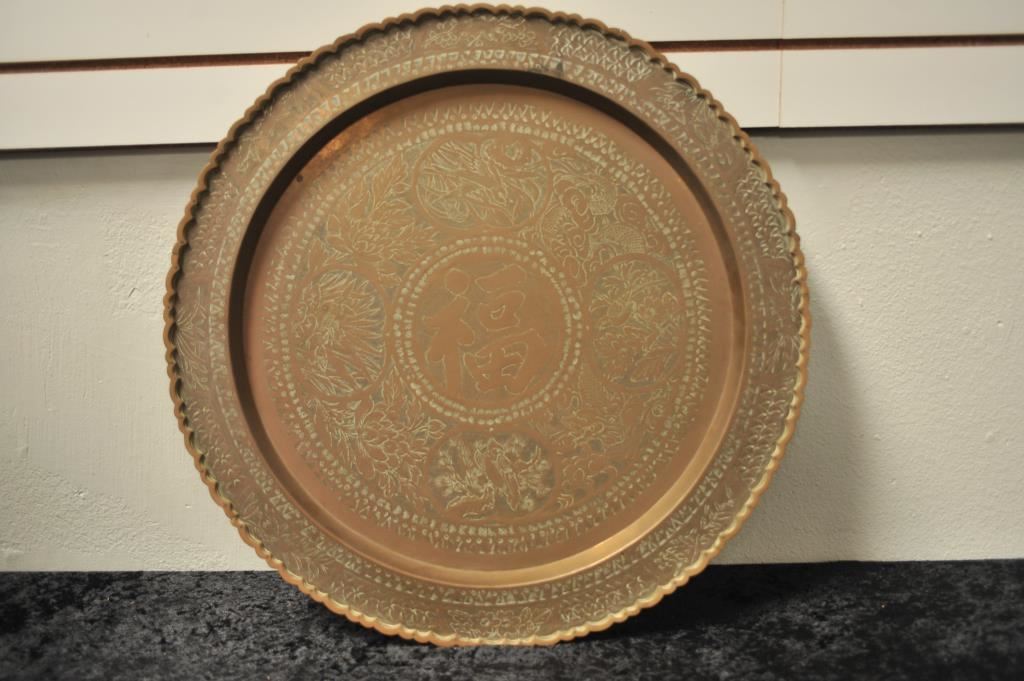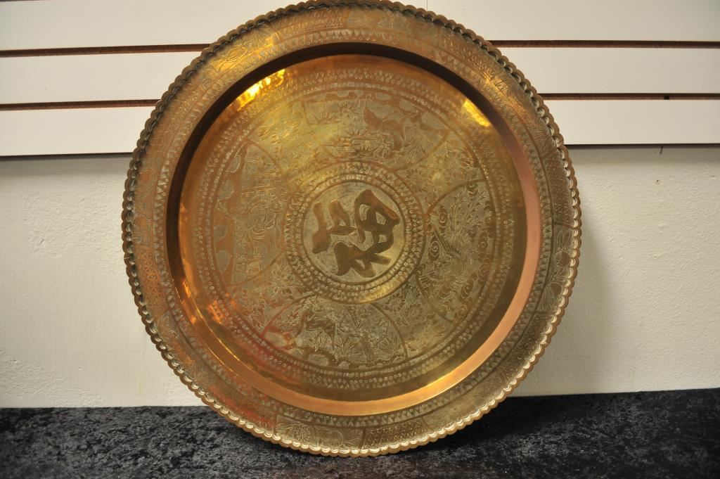 Lot of two large brass and copper circular wall hangings with fancy engraving and embossing. Measures 26” across and 22” respectively. Marked made in Hong Kong. Collected 1958-62 by Major Cable while on tour of duty. Est.: $100-$300