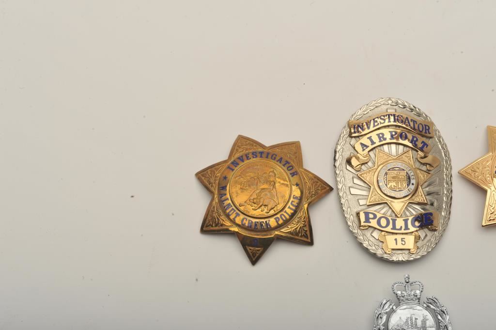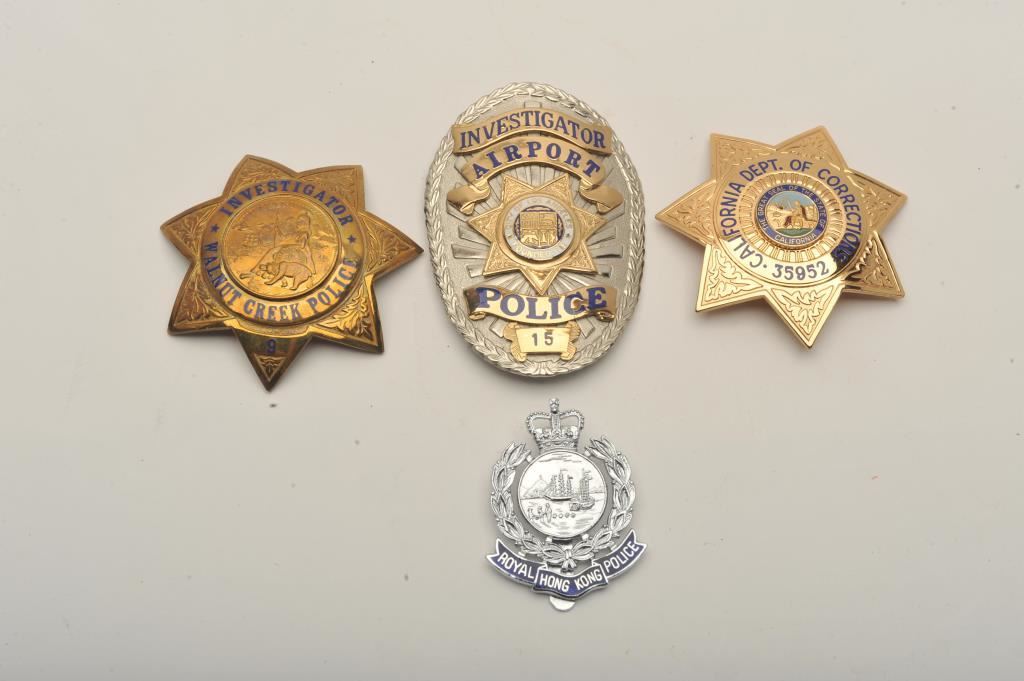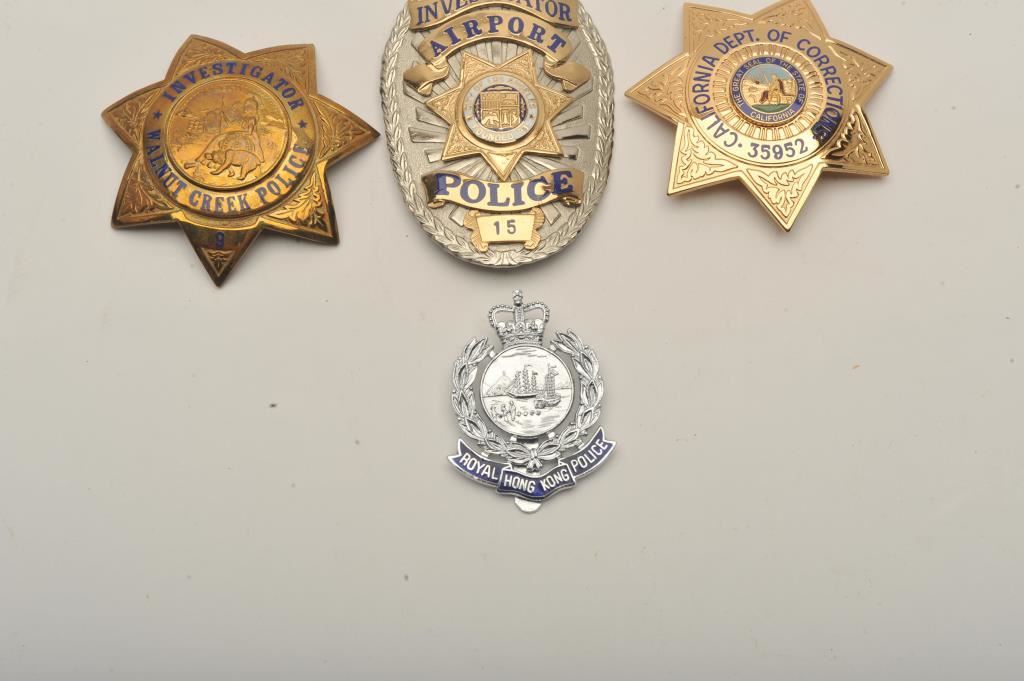Lot of 4 badges including a 7-point star pin badge marked California Dept. of Correcctions, #35952, hallmark Blackinton, a pin shield badge marked Investigator, City of Los Angeles Police #15, a 7-point pin star badge marked Investigator, Walnut Creek (Calif.) Police, #9, hallmark Sun Badge Co./L.A. County and a Royal Hong Kong Police small clip shield badge, hallmark Firmin/London. Est.: $150-$300.