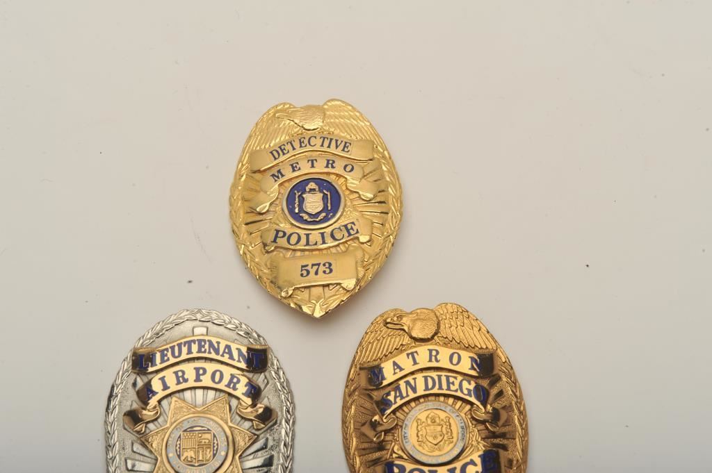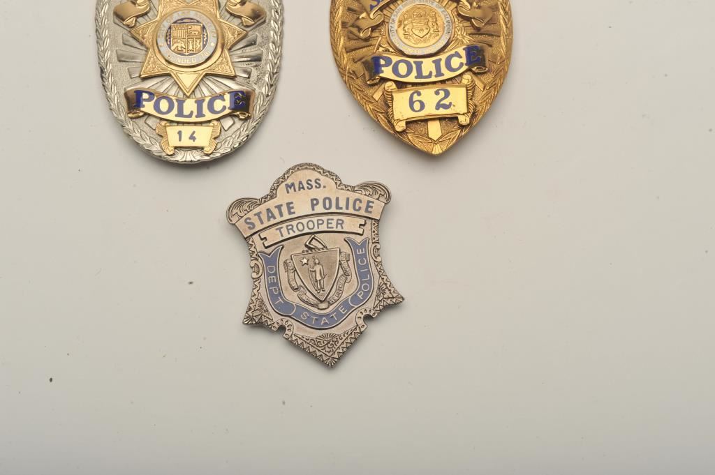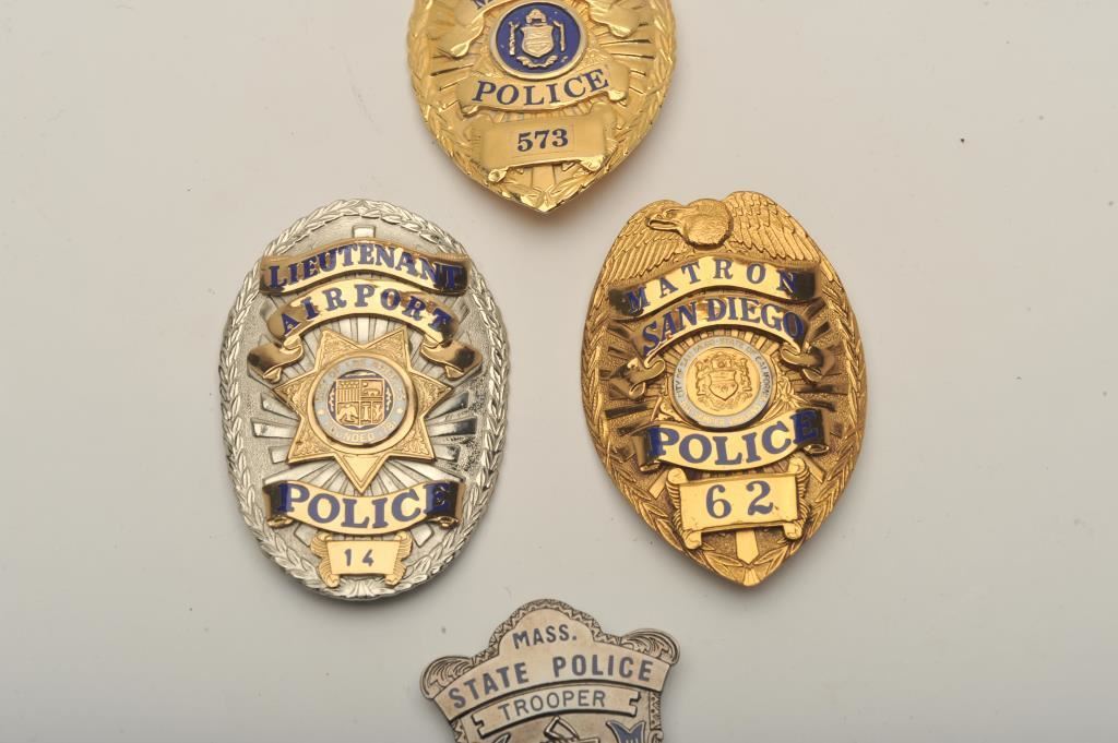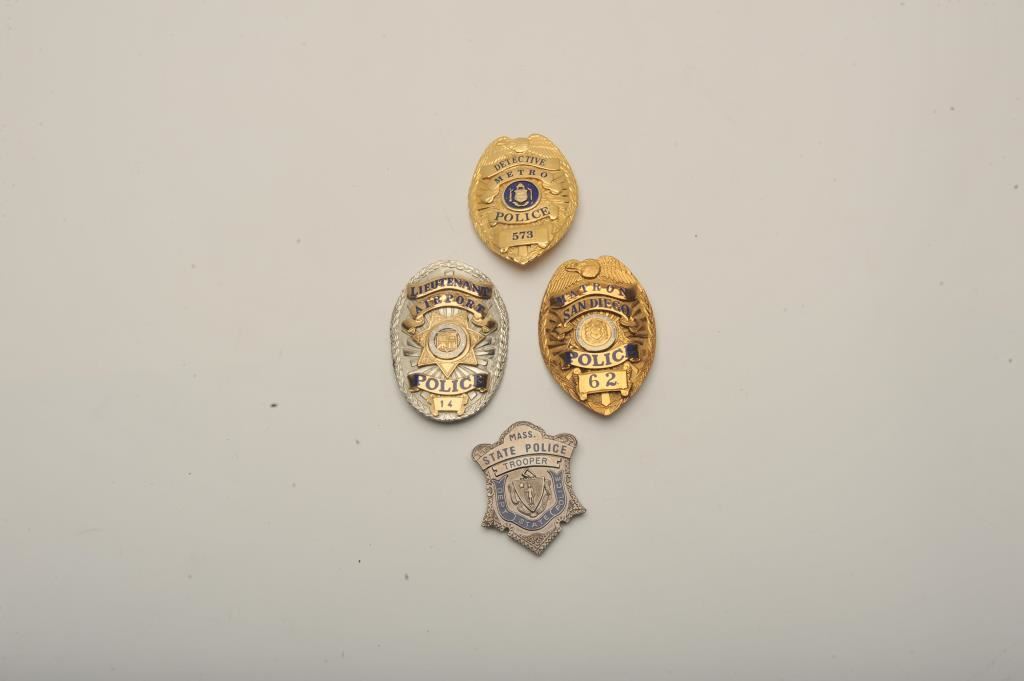 Lot of 4 badges including a Lieutenant City of Los Angeles (Calif.) Airport Police pin shield badge #4, a San Diego (Calif.) Police Matron pin shield badge #62 (hallmark L.A. Stamp & Staty Co.), a Metro Police Detective pin shield badge #573 and a Mass. State Police Trooper clip shield badge. Est.: $150-$300.