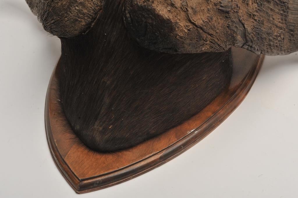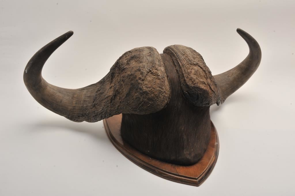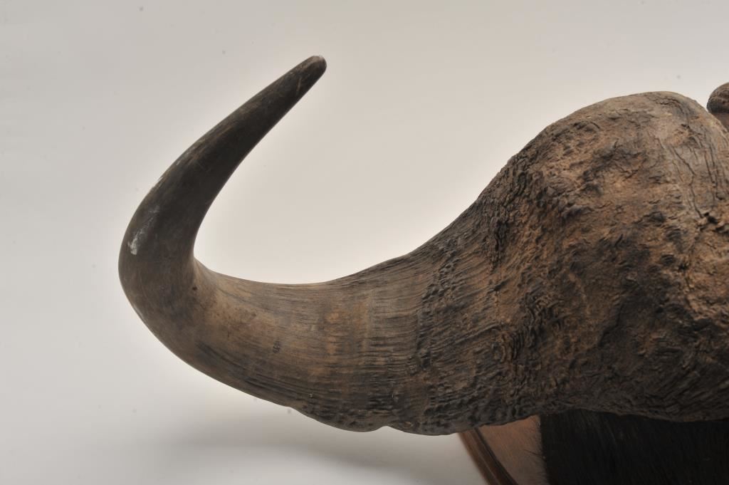 Cape buffalo horn mount. Approximately 35” across outside. Needs cleaning from storage. Good condition. Est.: $250-$500