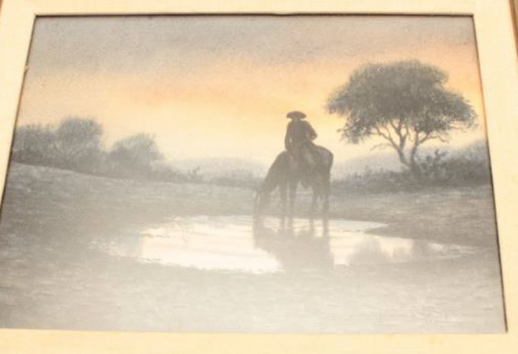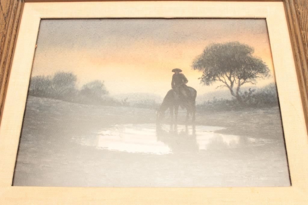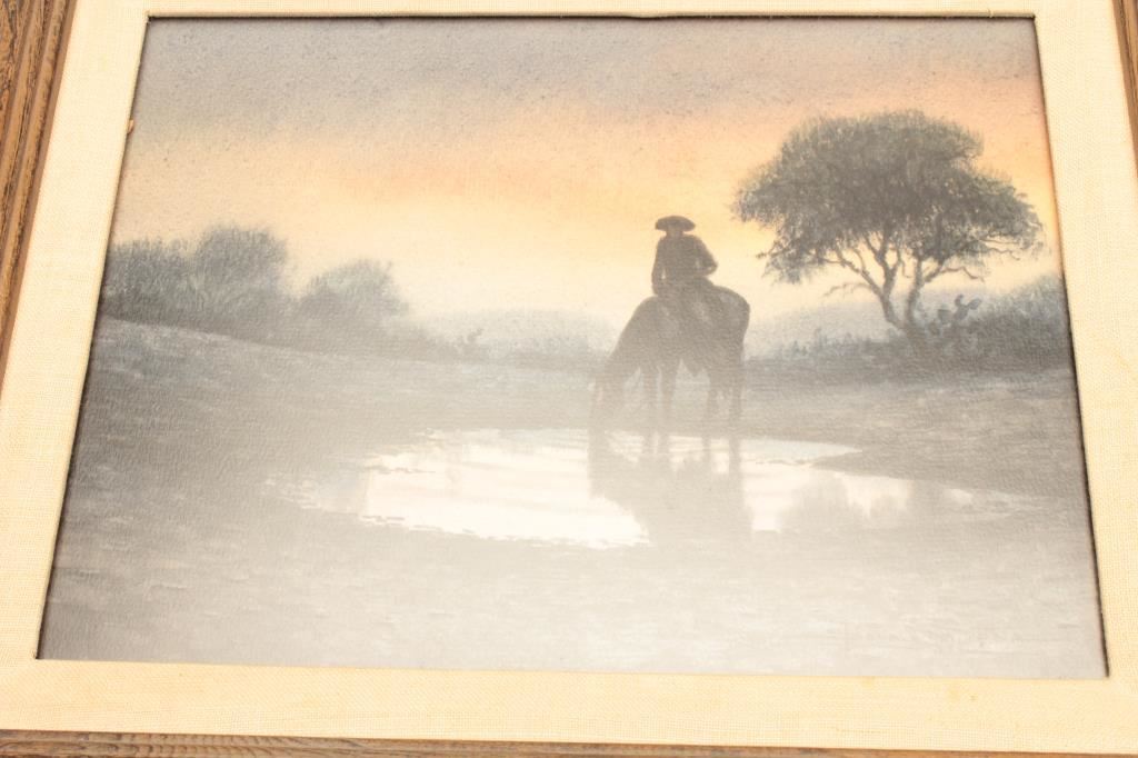 Framed watercolor by Don Yena entitled “Early Water” displaying a cowboy on horseback at a watering hole, approximately 15” x 18” overall. Est.: $500-$1,000.