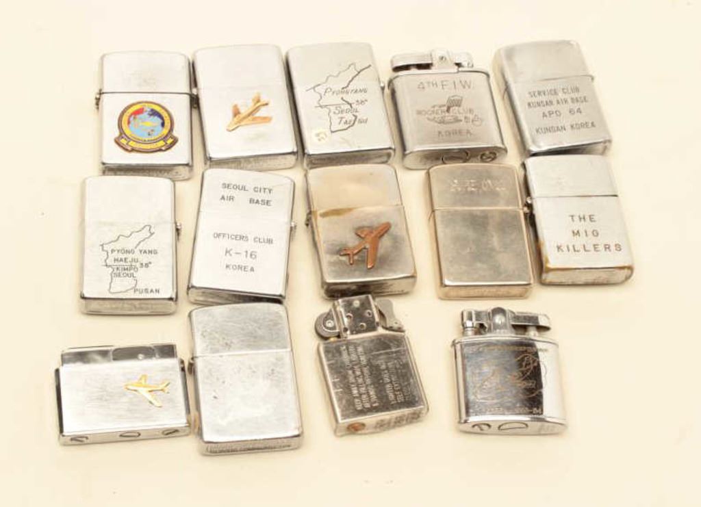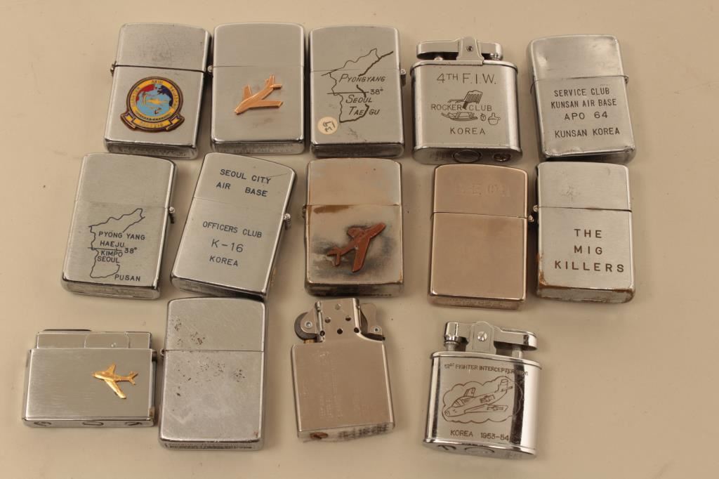 14-Zippo lighters as a lifetime collection, Korea to Vietnam, most Air Force marked or locations, Les Gilman Collection. Est:$500-1000