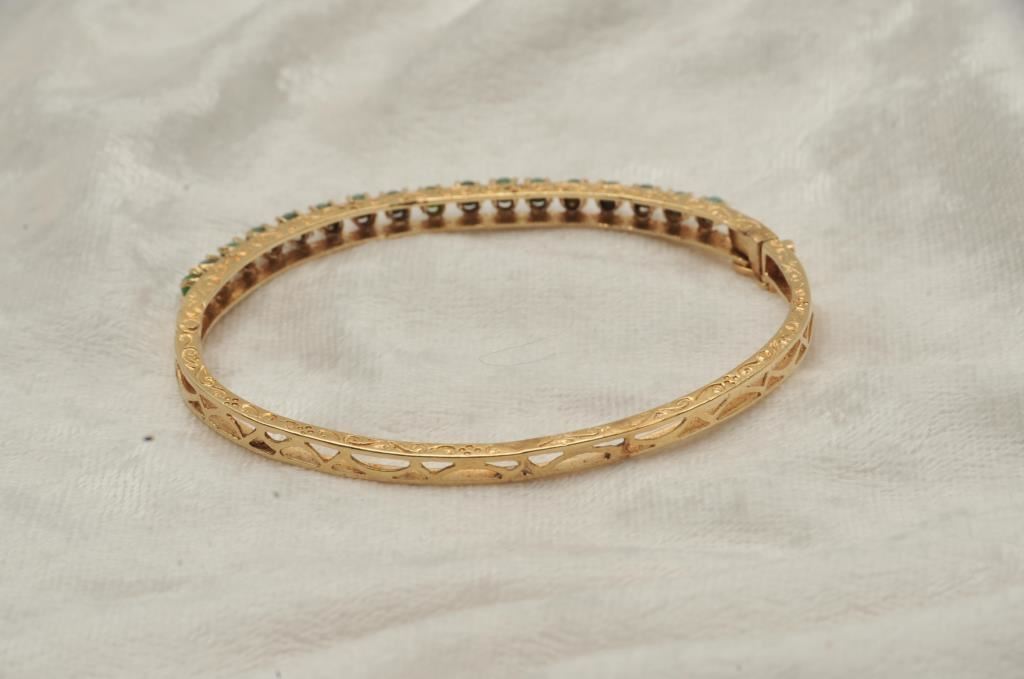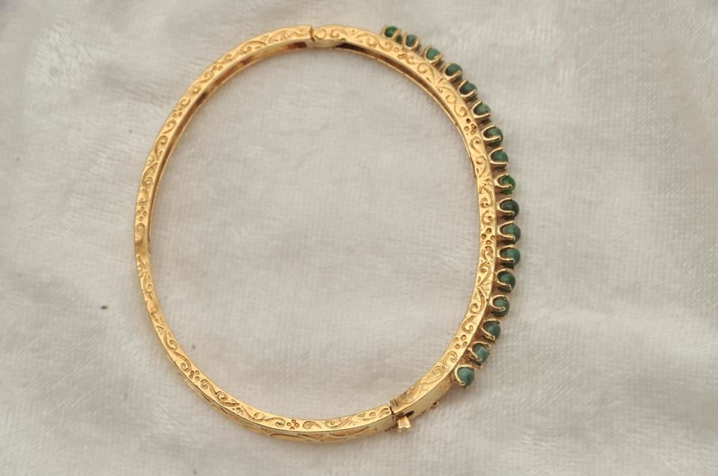 One hand fabricated bangle bracelet set with green jade beads made in 14k yellow gold weighing 12gms Est:$300-600