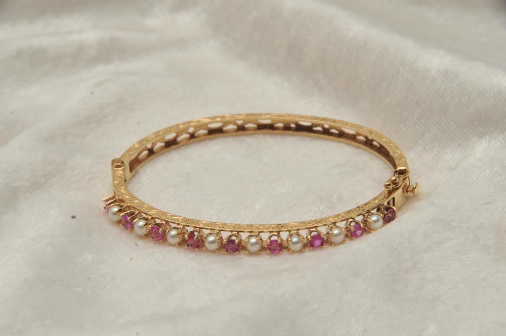 One hand fabricated bangle bracelet set with rubies and pearls made in 14k yellow gold weighing 12gms Est:$300-600