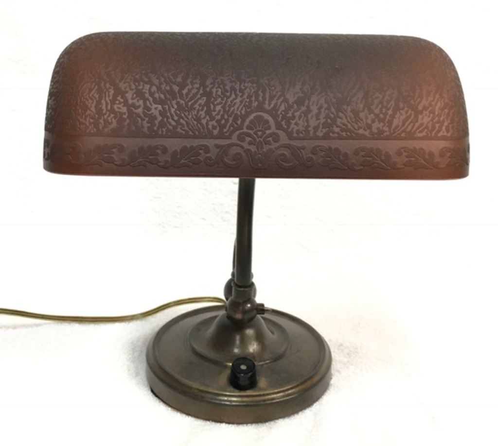 Top of the line Bankers lamp with rare brown etched Emeralite shade & bronze base. 9" T x 8" W. Est.:$300-$600.