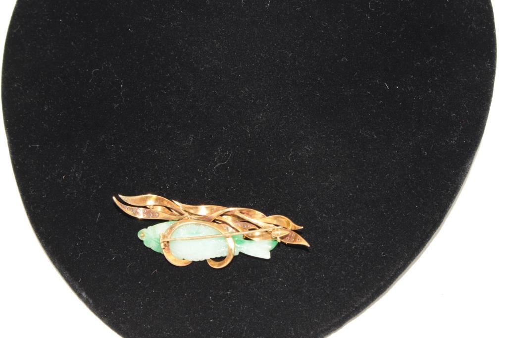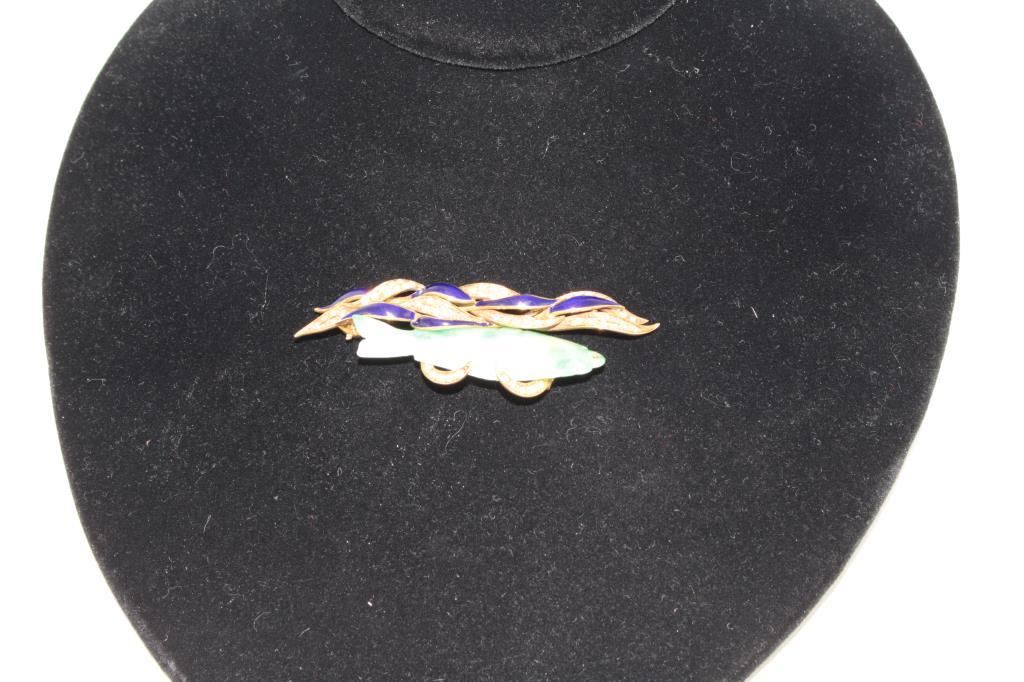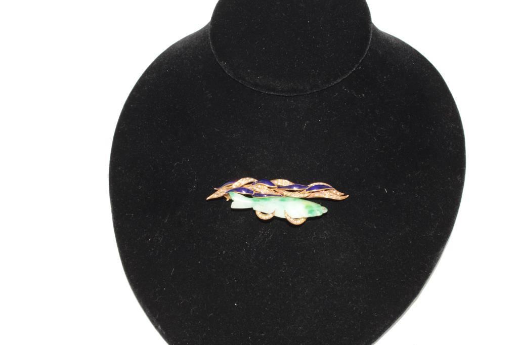 Authentic Oriental Jade Carving Mounted in vintage gold pin with blue enamel and European cut small diamonds circa turn off century to 1920s possibly French but unmarked. 10-14k gold. Priced 1800 by Orange Circle Dealer in antique jewelry. Jade shows blush of bright green and white with some translucence. Probably French made. Est:$800-1600