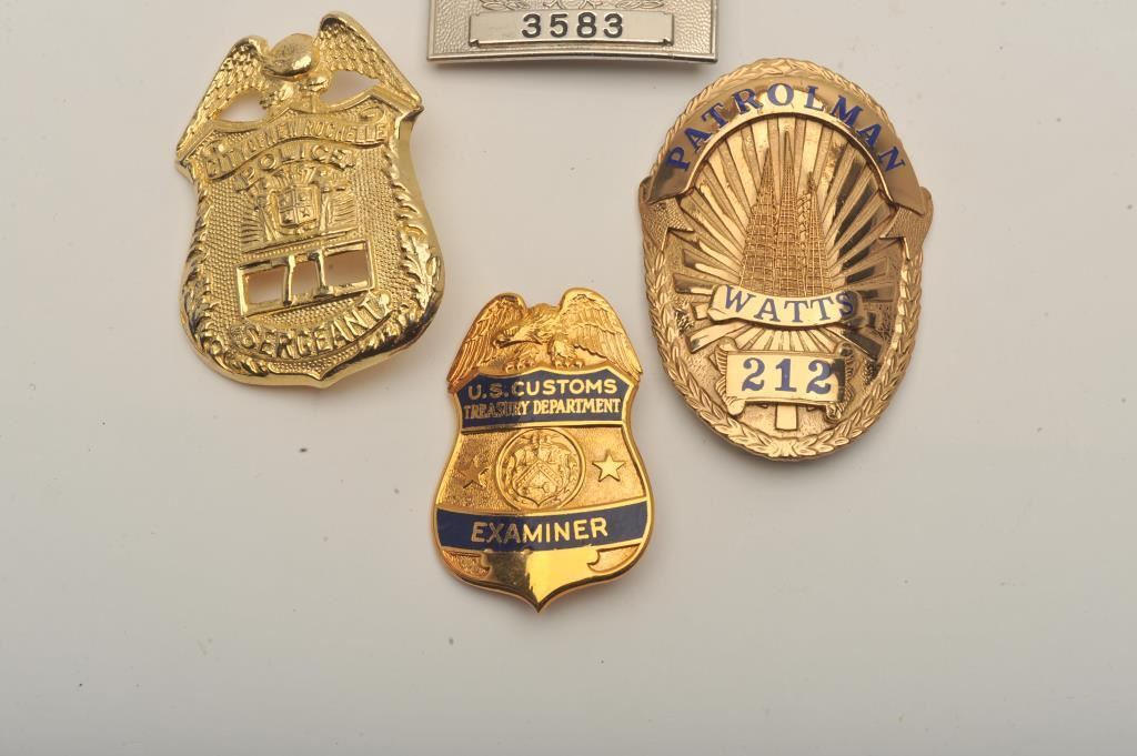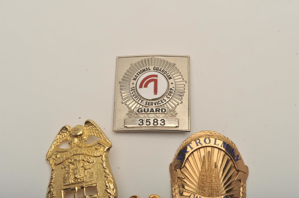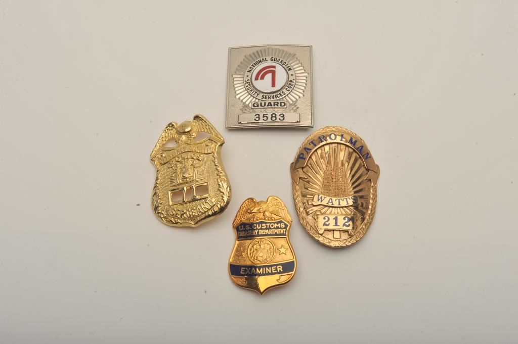 Lot of 4 badges including a U.S. Customs Treasury Dept. Examiner pin badge, a City of New Rochelle Police Sergeant cap badge, a National Guardian Security Services Corp. Guard pin badge (#3583) and a fantasy Patrolman Watts (#212) pin shield (Watts Towers, LA). Est.: $150-$300.