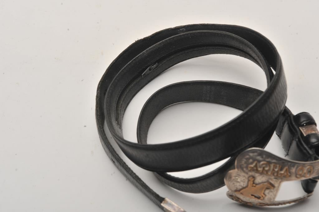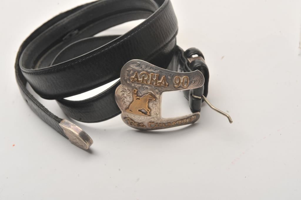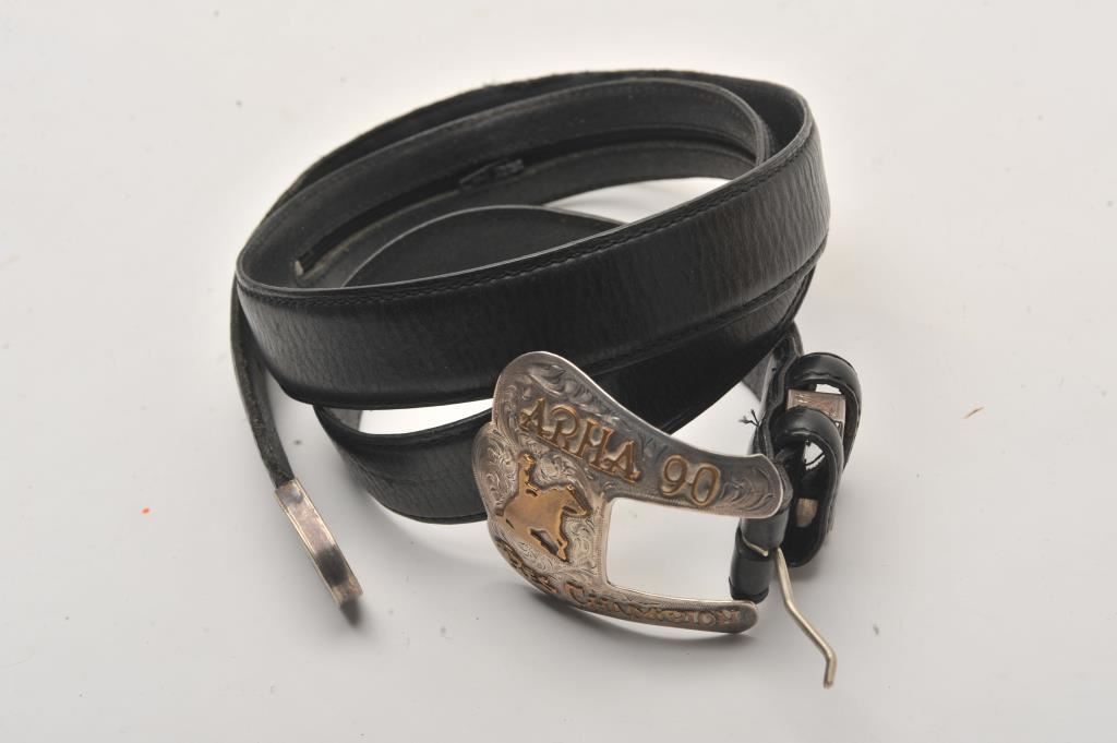 Fancy western belt buckle with money belt in custom leather. ARHA Champion 1990. Unmarked, Size approx. 46-48. Est. $100-200