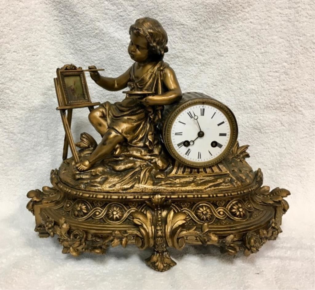 French spelter figure of girl painting on canvas clock. Working and comes with key & pendulum. 16"w x 13"t. Est:$400-700