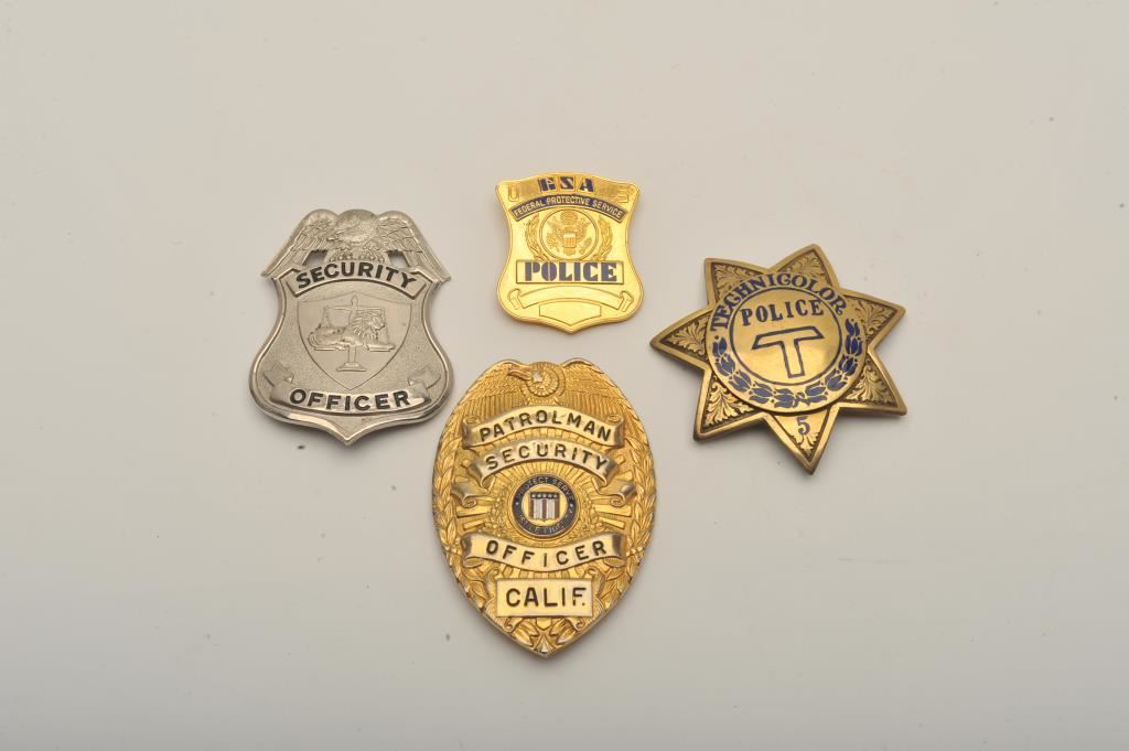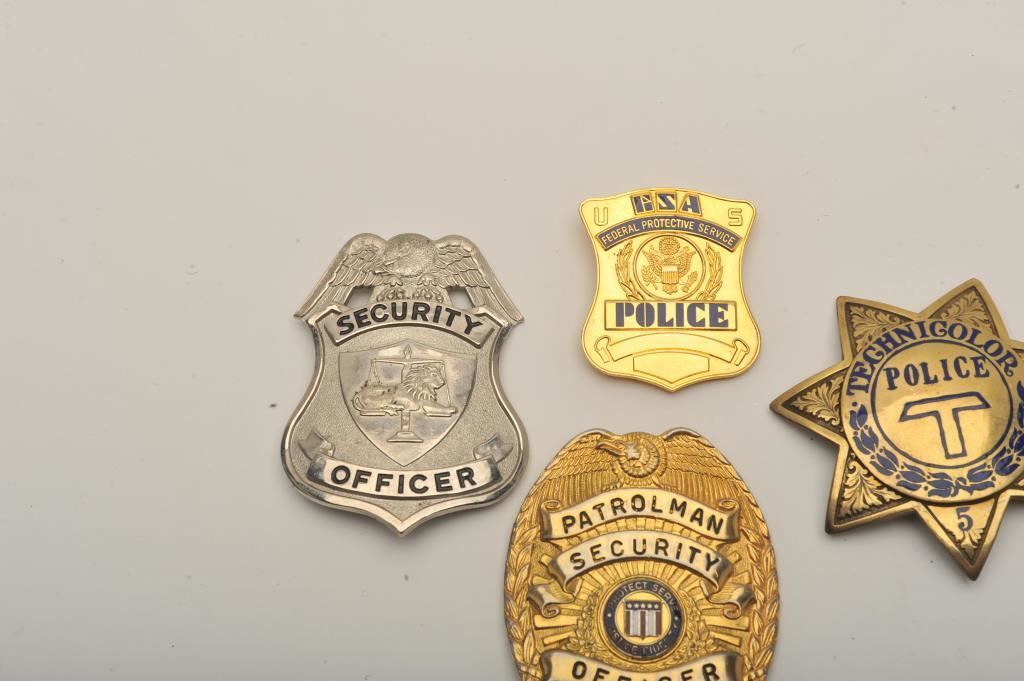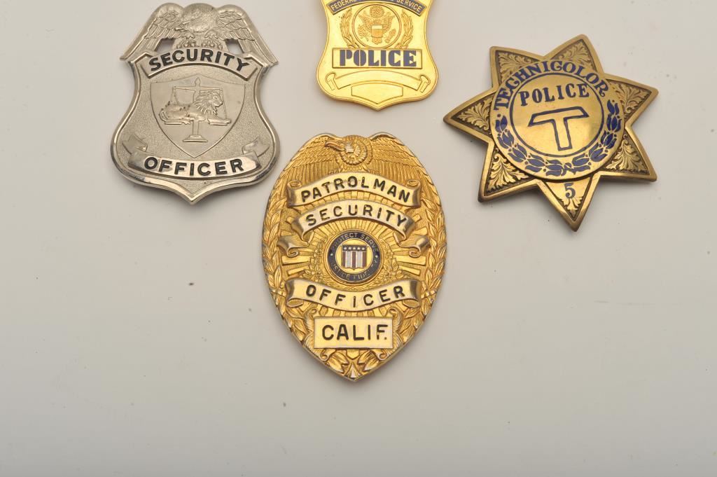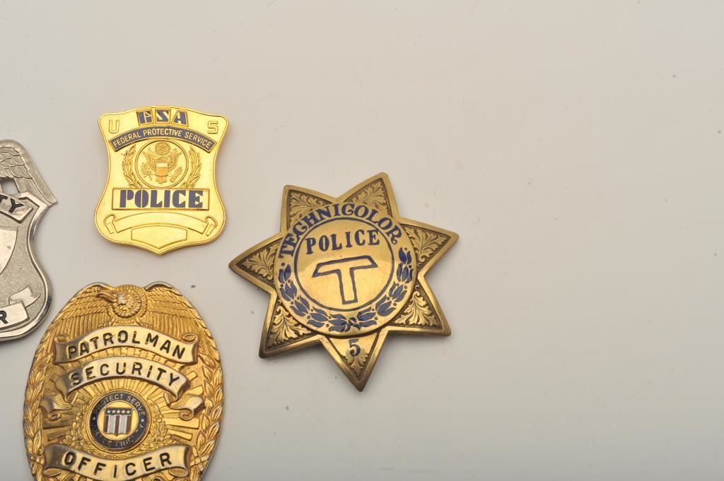 Lot of 4 badges including a Federal Protective Service Police clip badge, a 7-point Technicolor Police #5 marked star pin badge, a Security Officer pin shield badge and a Patrolman Security Officer, California pin shield badge. Est.: $150-$300.