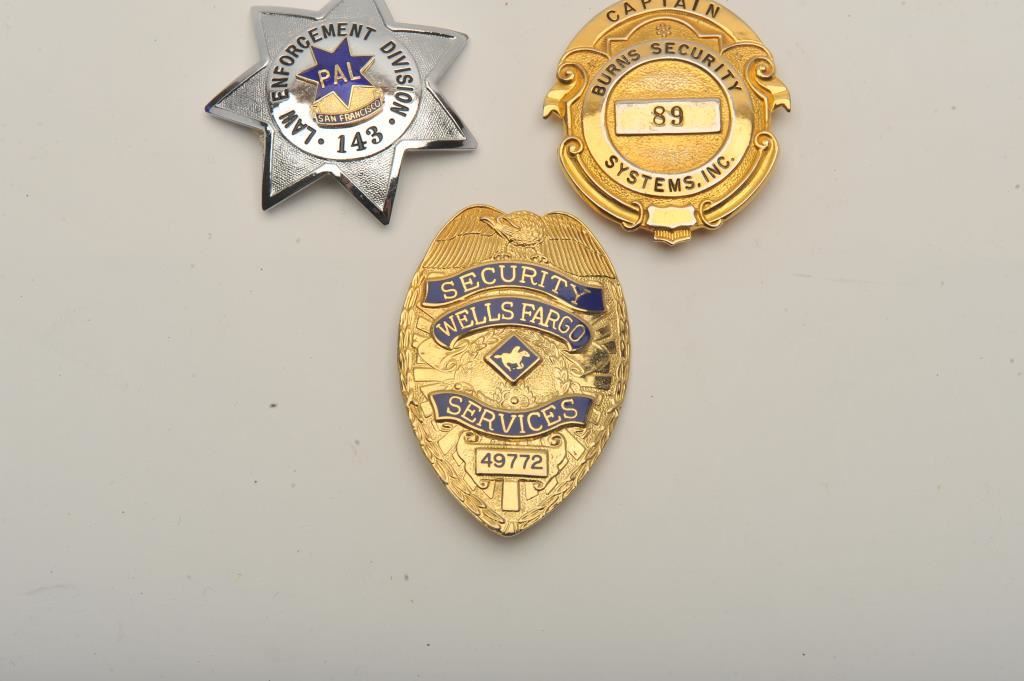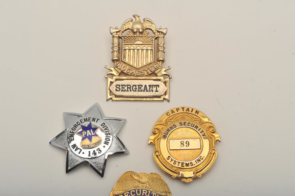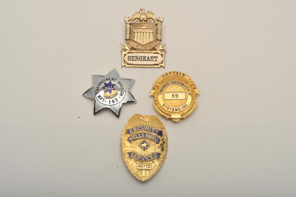 Lot of 4 badges including a Wells Fargo Service Security pin shield badge (#49772), a Rochester Sergeant shield badge, a Burns Security Systems, Inc. Captain pin shield badge and a 7-point star pin badge marked “Law Enforcement Division/PAL (Police Activity League/San Francisco/#143). Est.: $150-$300.