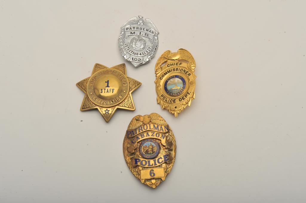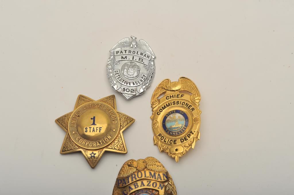 Lot of 4 badges including a Patrolman Cabazon (California) Police pin shield badge (#6/hallmark “Sun Badge Co.”), a State of Tennessee Chief Commissioner Police Dept. pin shield badge (hallmark “Blackinton”), a Patrolman M.I.B. Detective Agency (#102) pin badge and a United Artists Studio Corporation #1 Staff 7-point star pin badge. Est.: $150-$300.