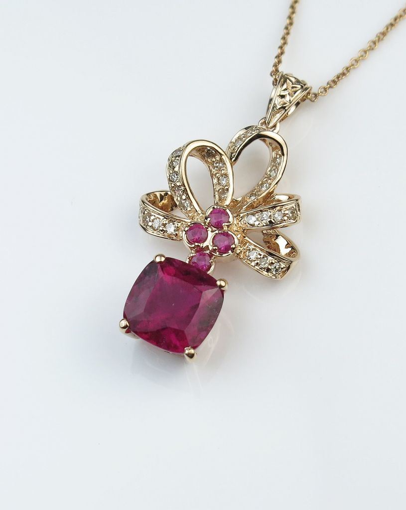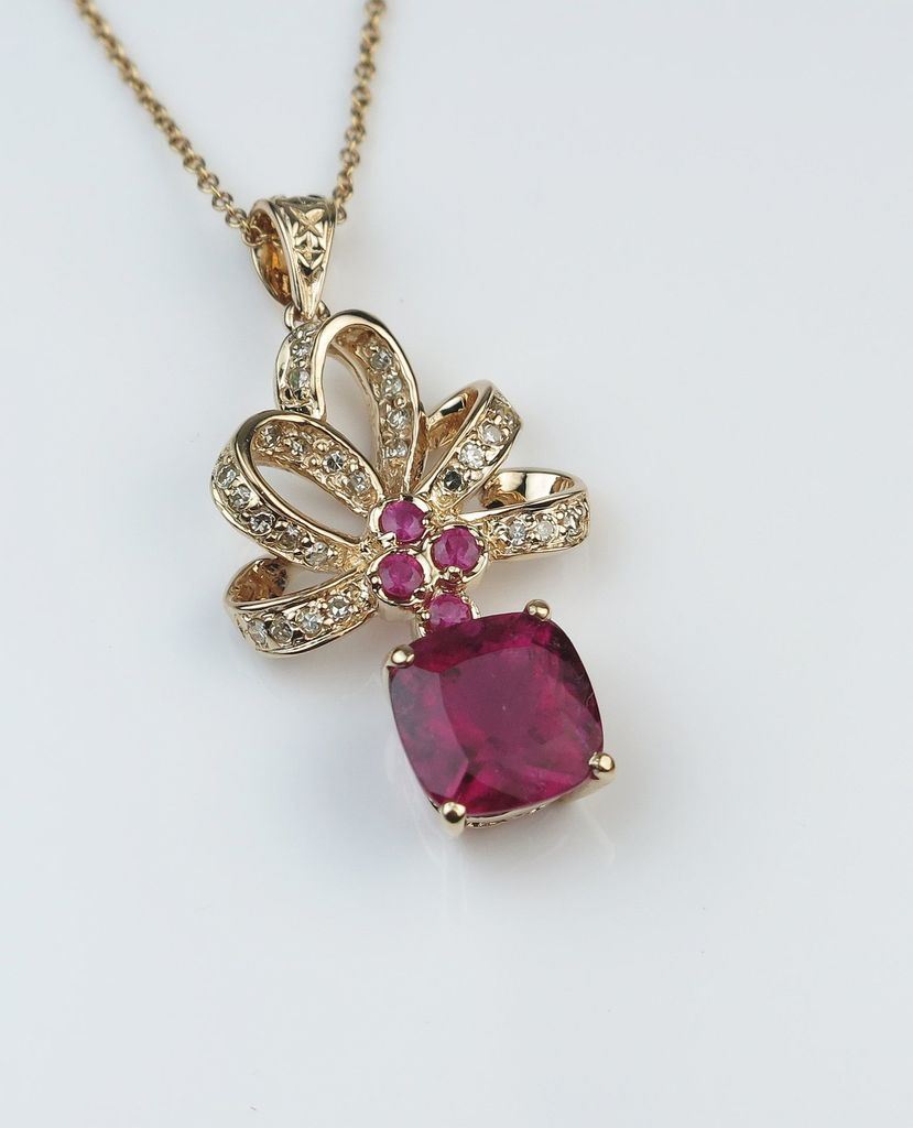 Amazing Rubellite Tourmaline Diamond and Ruby Pendant featuring an intensely colored cushion cut Tourmaline weighing 3.15 carats set with 38 round Diamonds and Rubies set in a 14 karat rose gold vintage bow style setting. Retail $3,000-$4,000 Estimates $1,500-$2,000