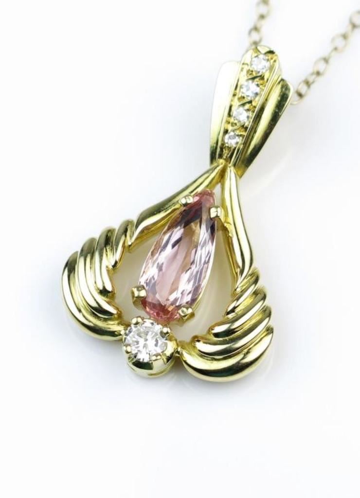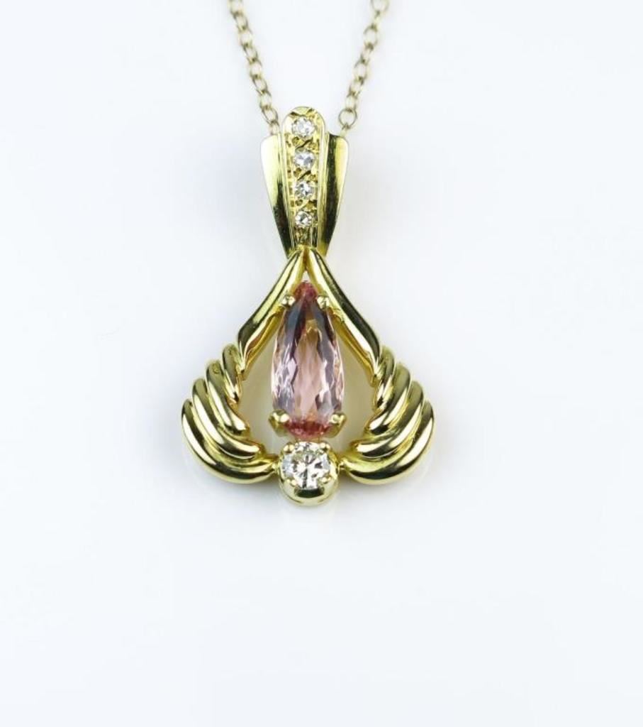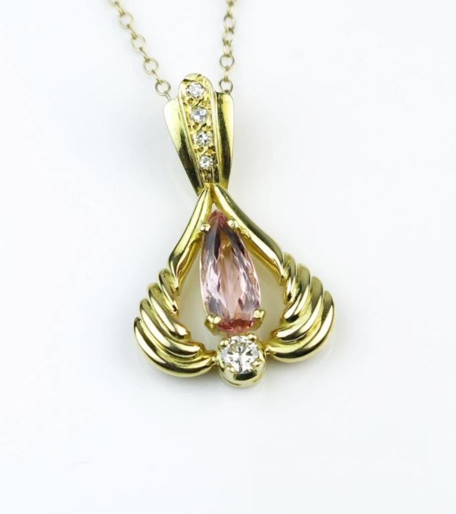 Art Nouveau Inspired Imperial Topaz and Diamond Pendant with rare peach/pink colored Imperial Topaz cut into a pear shape weighing approx. 2.00 carats accented with a round cut Diamond with F-G colors and VS clarity set in 18 karat yellow gold. Retail $2,000-$3,000 Estimates $1,200-$1,800