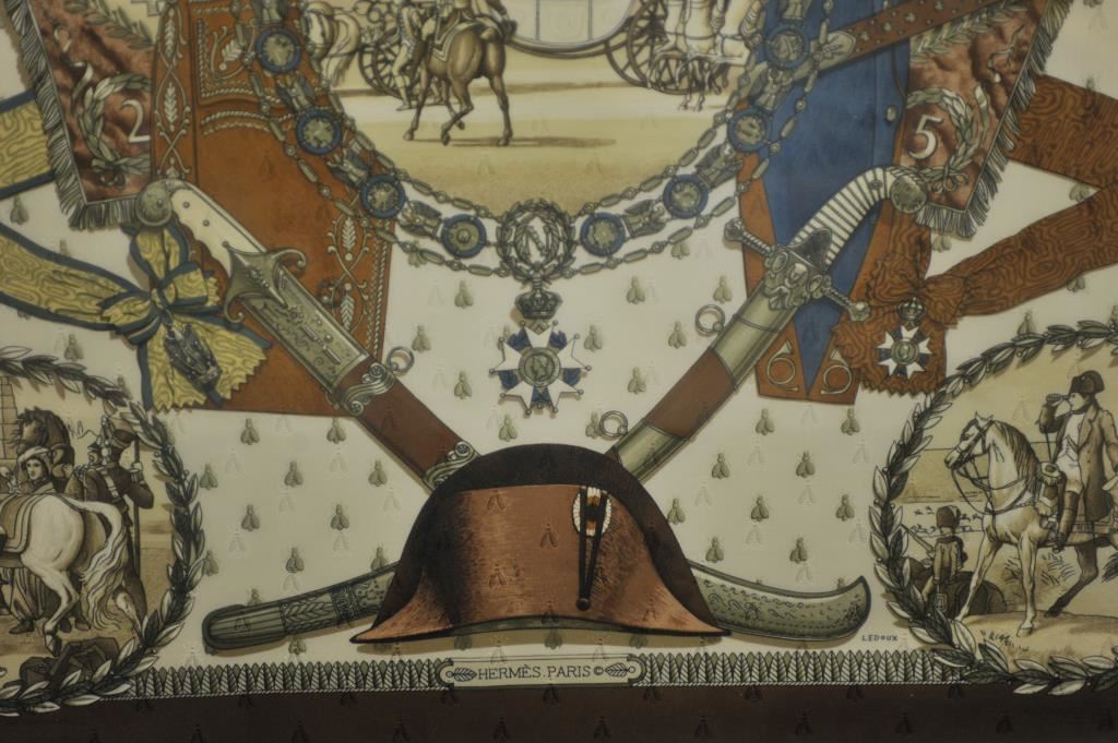 Framed Napoleon Hermes Silk Jacquard Scarf Vintage piece designed by Philippe Ledoux and first issued in 1963, re-issued in 1985. An intriguing combination of imperial symbolism and Napoleonic legend. First issue in an unbelievably good vintage condition. It has gorgeous colors with great color saturation in soft jacquard silk. .Measures approximately: 34 x 34 inches and 86 x 86 cm Est:$500-1000