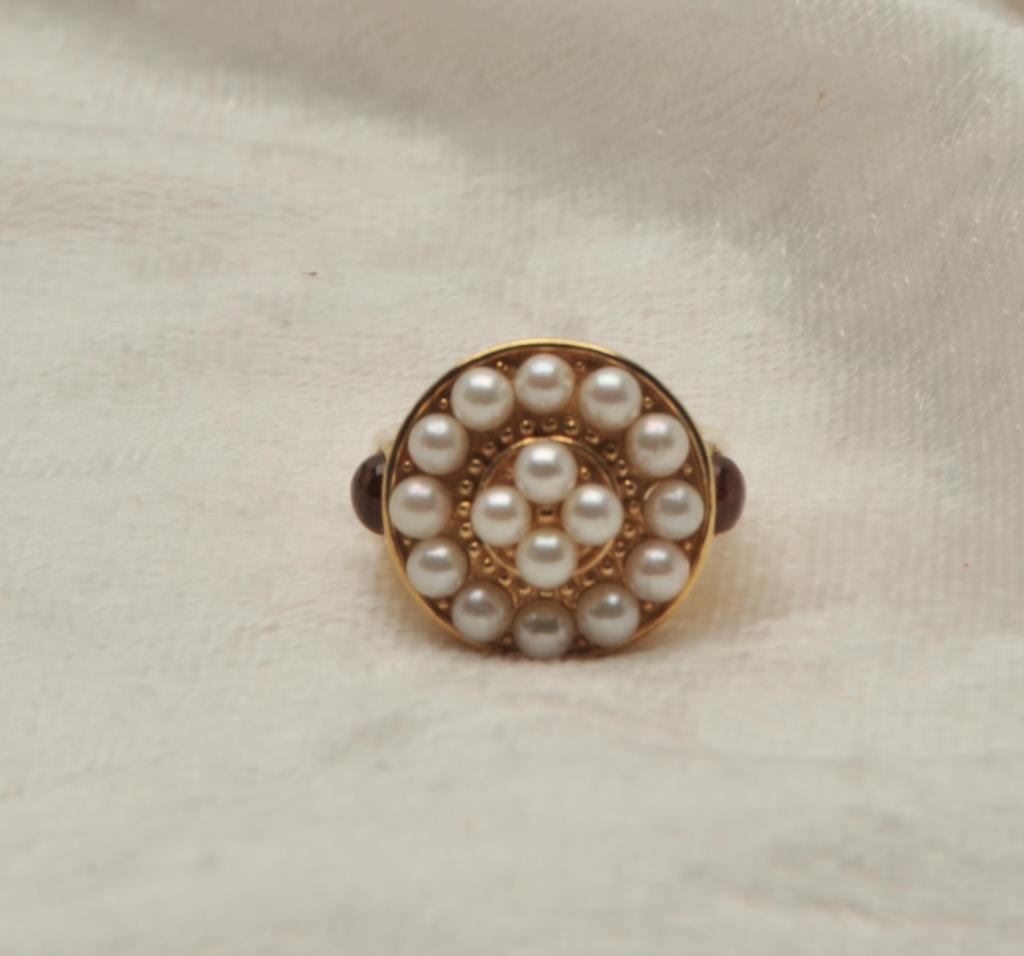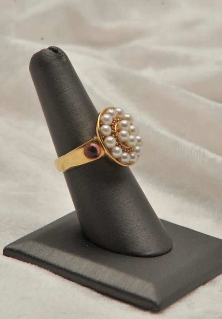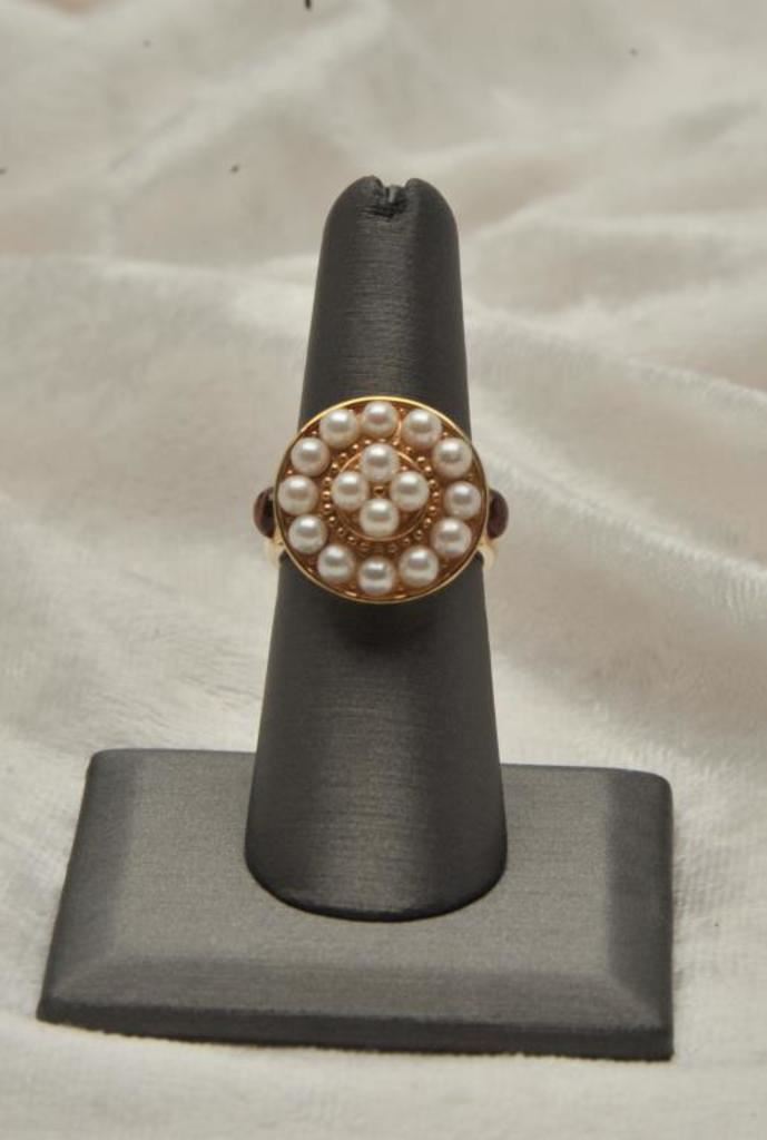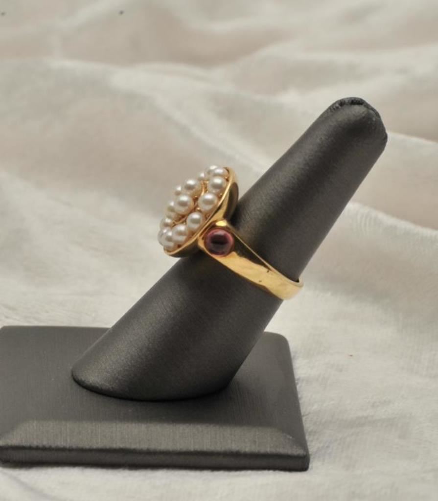 One pearl and ruby cabochon ring made in 18k yellow gold weighing 12 gms Est:$500-1000