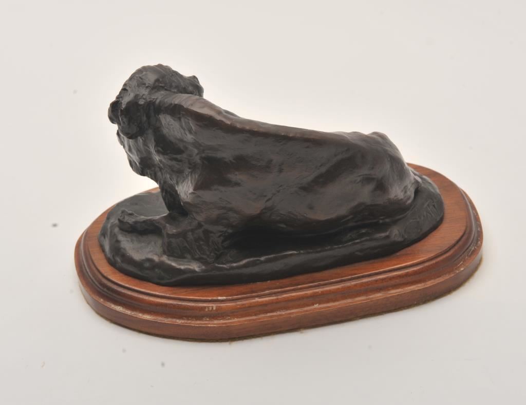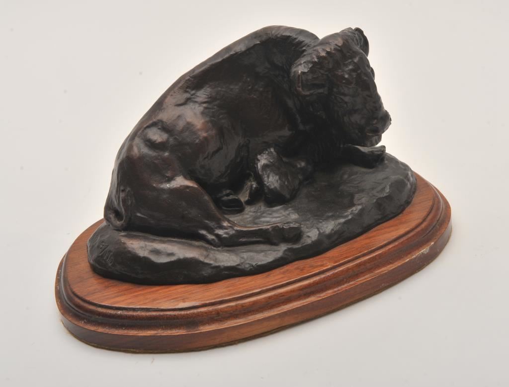 Posthumous bronze casting of buffalo by Dick Jones of Great Fall, MT. entitled “Lone Buffalo” by C.M. Russell. Jones had a frame shop and traded with C.M. Russell; Certificate #9 of 110; created off the plaster from the Russell estate; approximately 8.5” x 5 x 5. From the estate of Elmer E. Taylor. Est.: $1,000-$2,000.