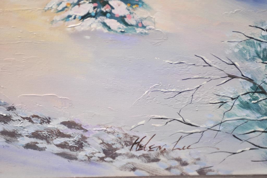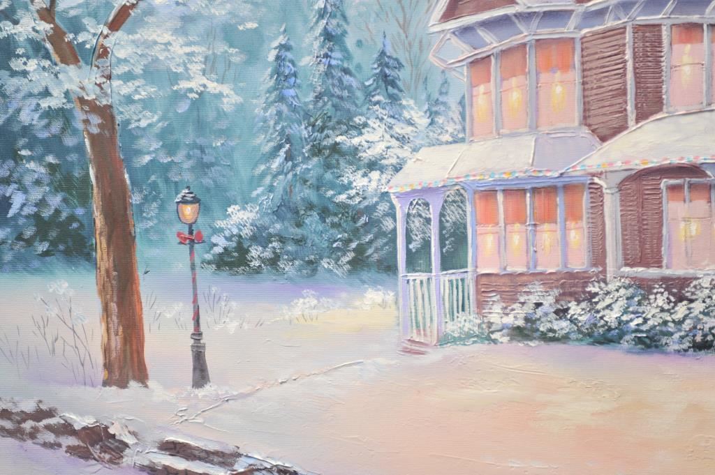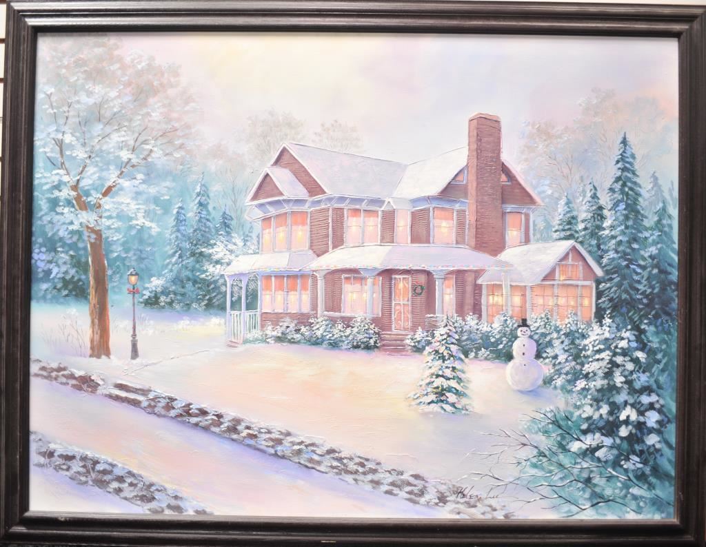 Oil painting on canvas signed Helen Lee. Darling scene of winter with snowman in the Eastern US. Nicely framed. 36" x 48". Est. $175-350