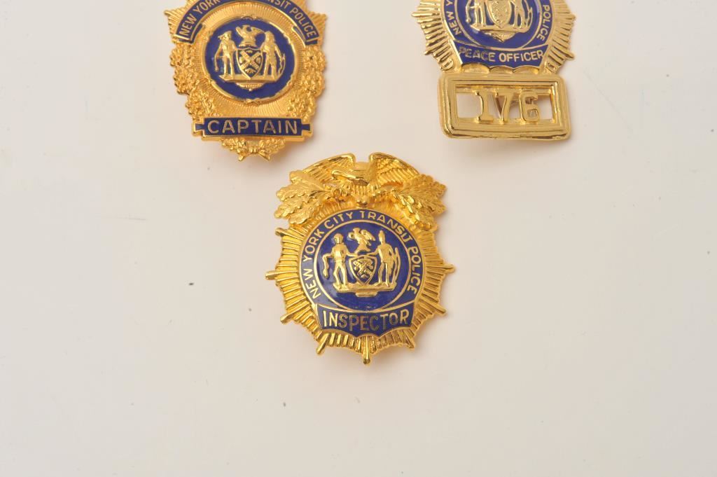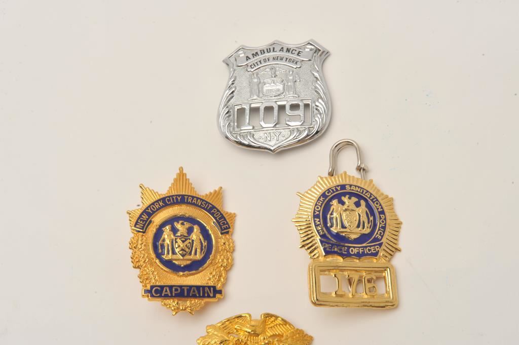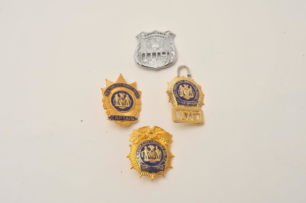 Lot of 4 badges including 3 cap badges; New York City Sanitation Police Peace Officer (176); New York City Transit Police Captain; New York City Transit Police Inspector and a City of New York Ambulance badge (109/no hallmark). Est.: $200-$400.