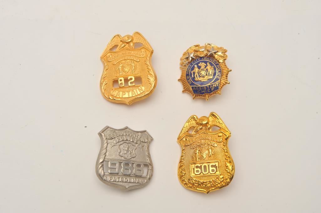 Lot of 4 cap badges including City of New York Correction Captain (82), City of New York Police Sergeant (606), New York City Transit Police Assistant Chief and Nassau County New York Police Patrolman (988). Est.: $200-$400.