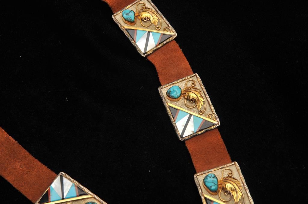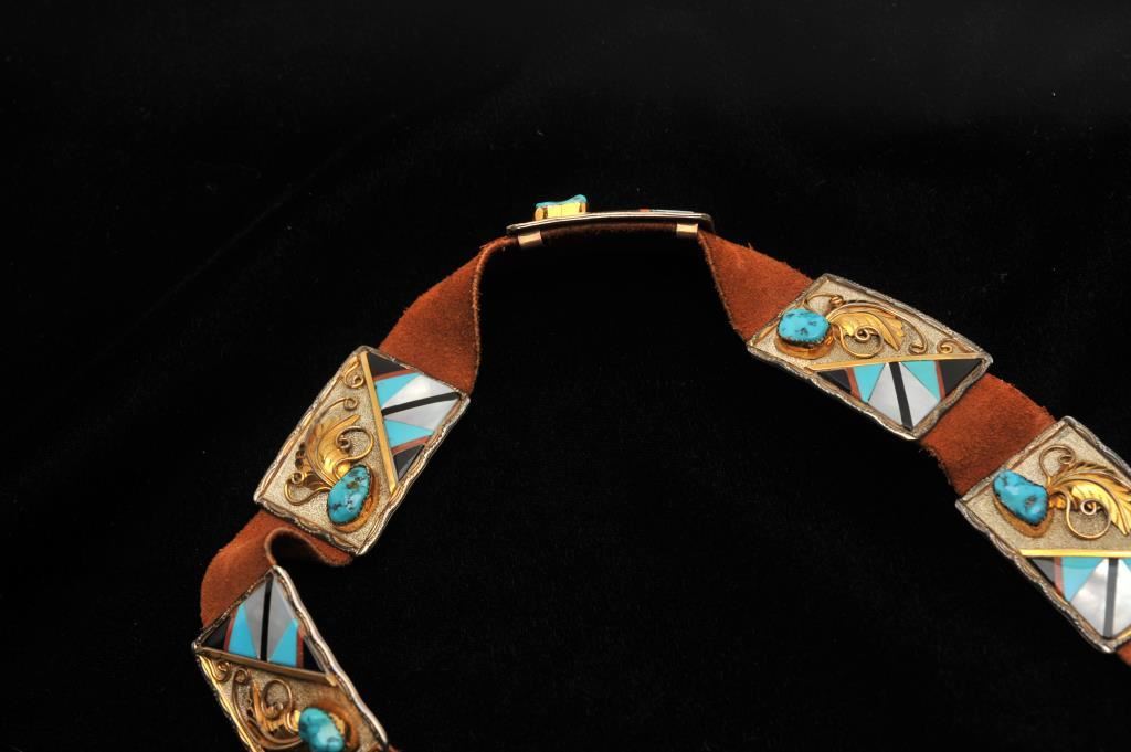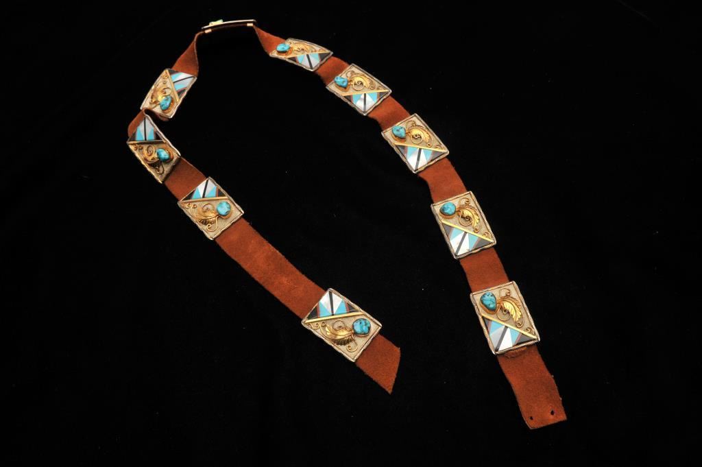 Exquisite Native American blade concho belt in Zuni style, mounted in 14k gold, sterling silver, coral, mother of pearl, onyx and turquoise. 10 small square silver conchos with 14k gold appliche and bezels around turquoise. Sterling marked. Jeweler estimates $1400-1600 of scrap value alone and retail of over $7500. Provenance - The estate of Joanne D. Hale, wife of "Monty Hale", Founder and President of the Autry Museum. A gift from Odell Jones (wife of Buck Jones - famous cowboy western star). Est. $2000-4000