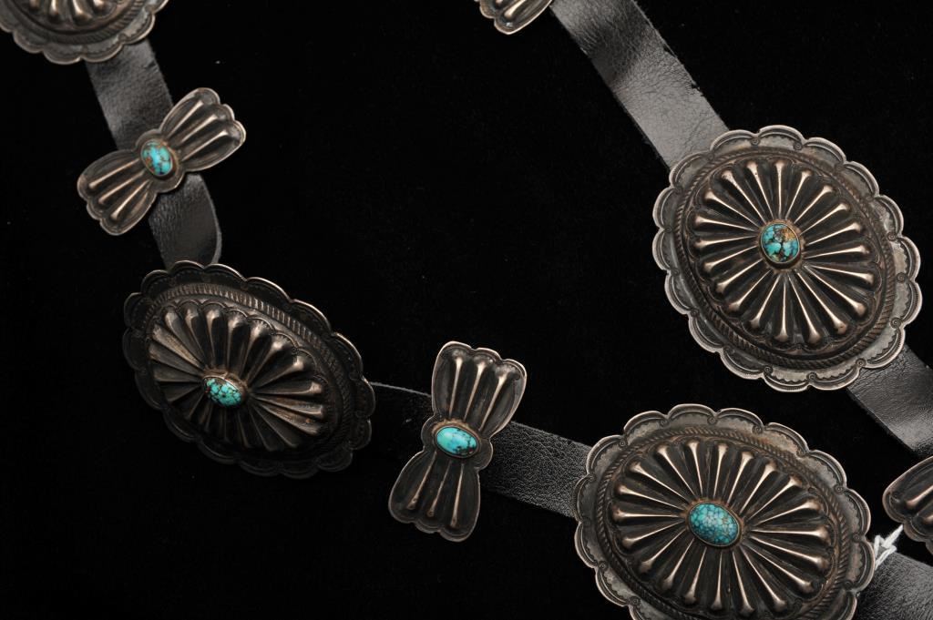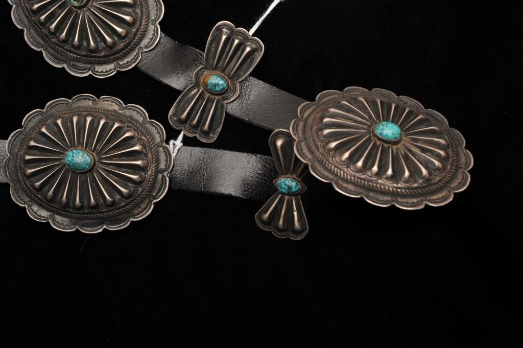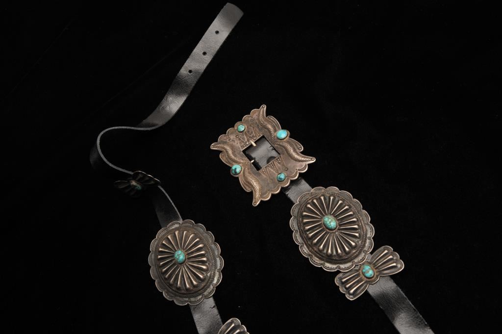 Early handmade and authentic Native American concho belt from pre-war era. 13 pieces - hand made and sand cast with copper loops. Sterling conchos and buckle. Natural turquoise nuggets. Leather replaced. Unmarked but tested. Est. $1000-2000