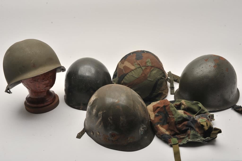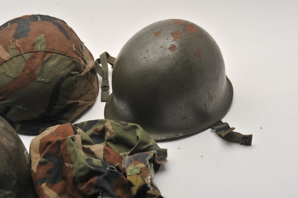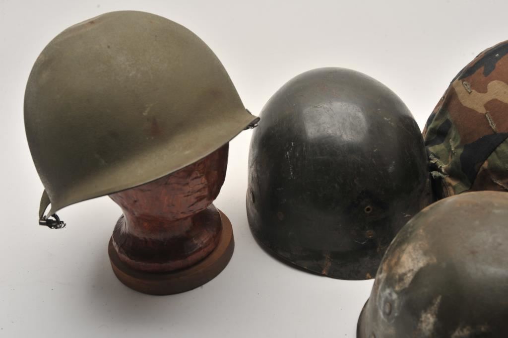 U.S. Army WWII armored division helmet with liner. Rear seam. Late straps. From Vietnam. Also repainted WWII helmet with liner. Kuwait period Kevlar helmet. 3 total. Good to very good condition. Est.: $150-$300