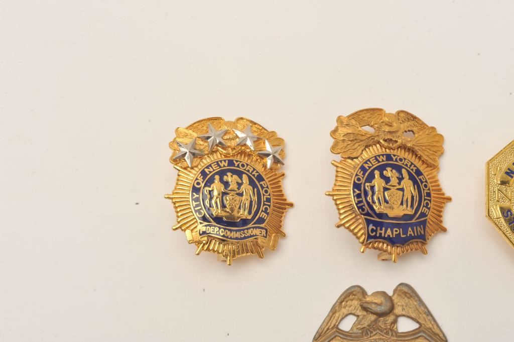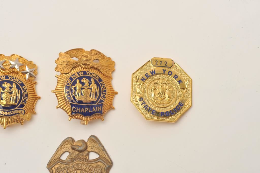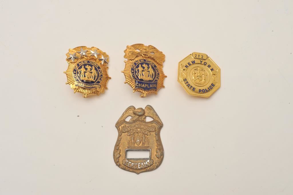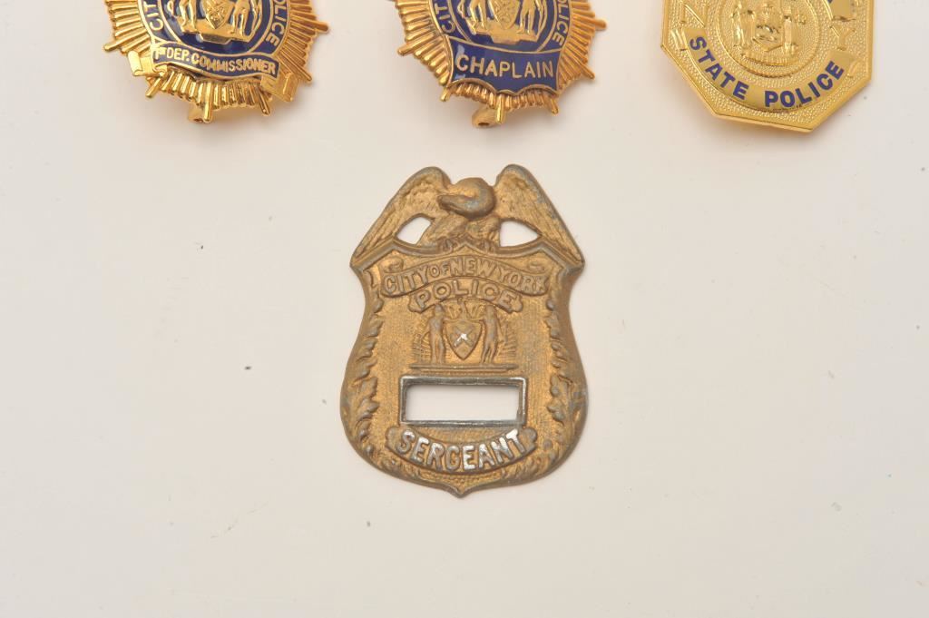 Lot of 4 badges including 2 City of New York Police cap badges, one for a Chaplain, the other for a Deputy Commissioner; also a new York State Police badge (212/no hallmark) and a City of New York Police Sergeant badge missing its pin and badge number. Est.: $200-$400.