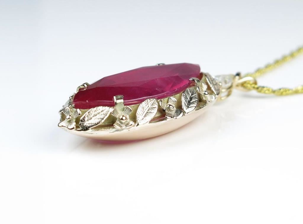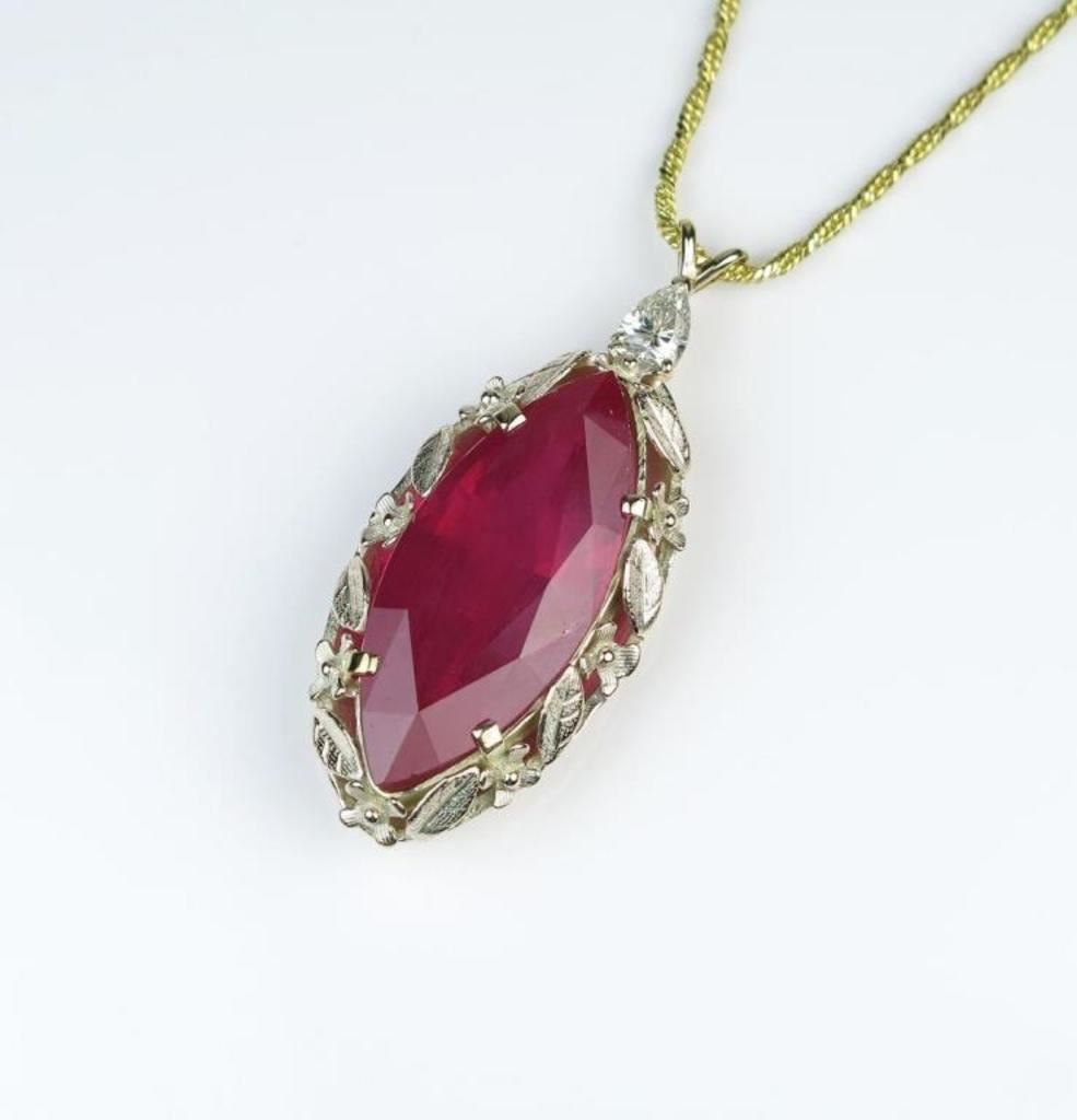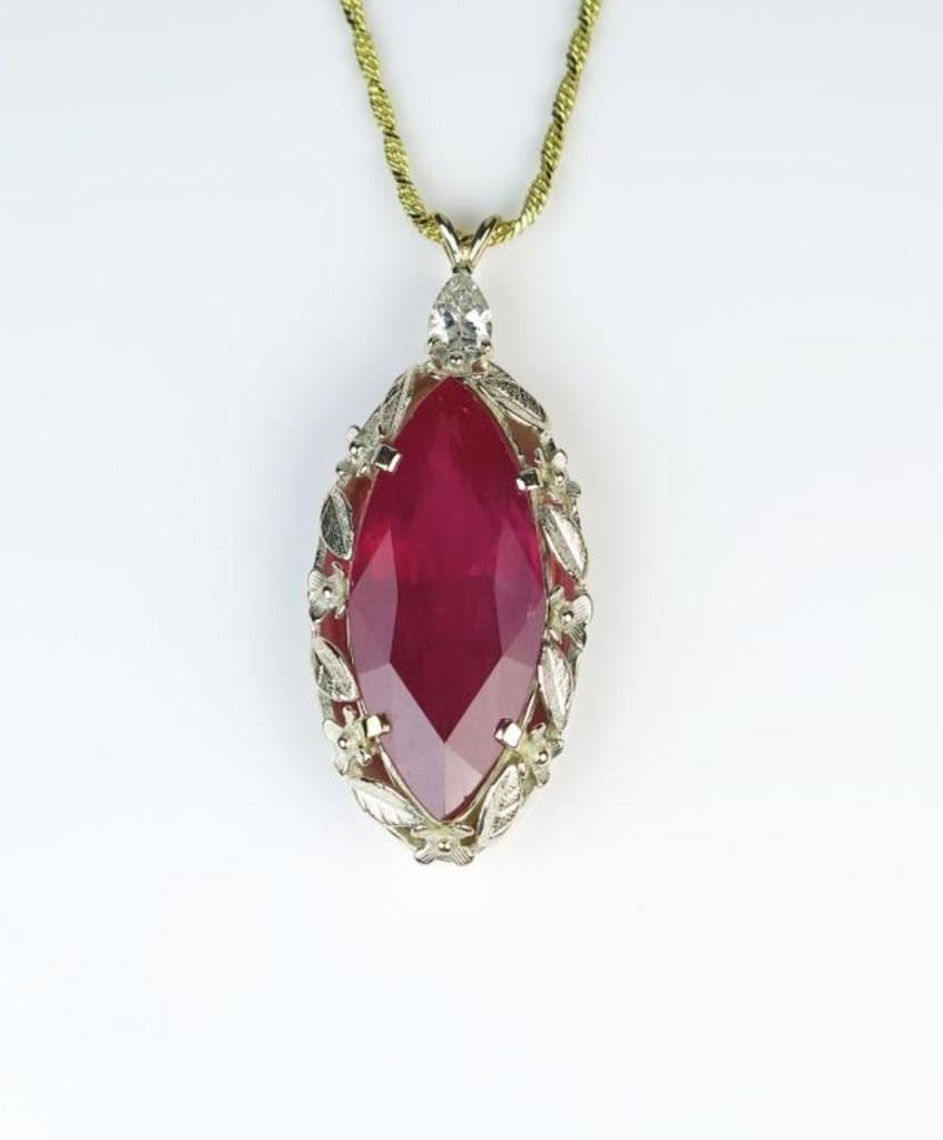 Extraordinary 21.75 carat Ruby and Diamond Pendant featuring a marquise shaped Ruby accented with a pear shape Diamond weighing 0.50 carats with G-H color and SI clarity set in a custom vintage style design set in 14 karat yellow gold. Retail $8,000-$12,000 Estimates $6,000-$9,000