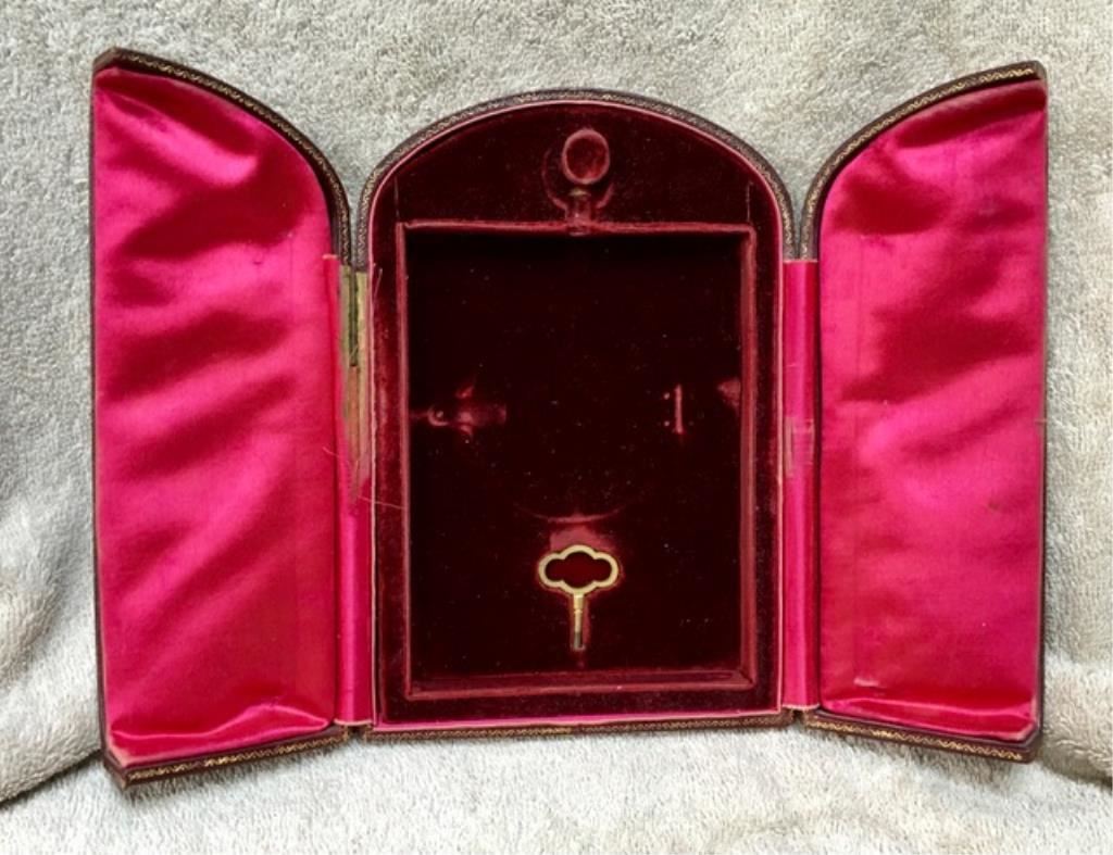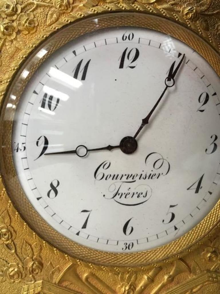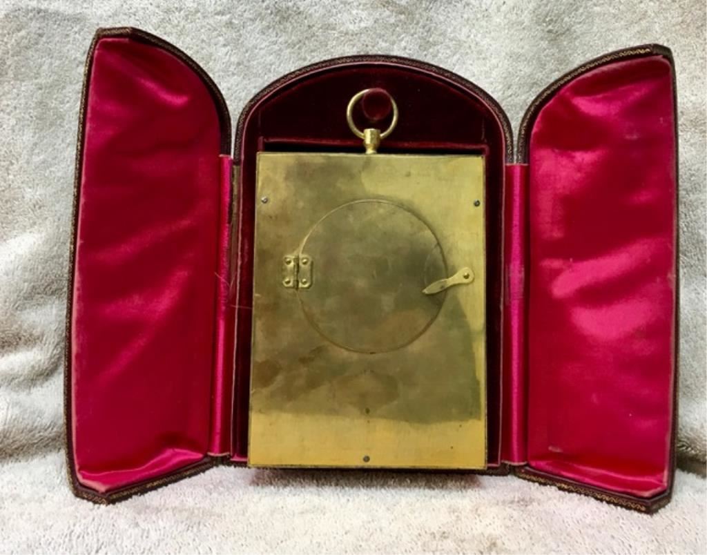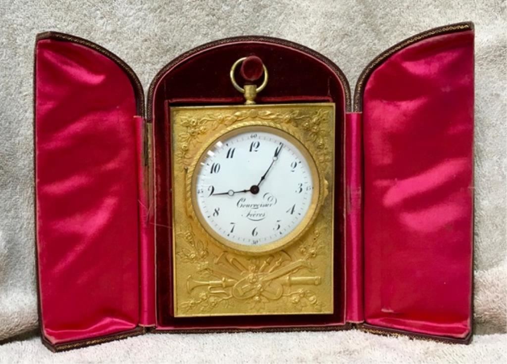 Rare gold gilt Napoleonic clock in original carrying case signed Courveisier Freres on dial. Circa early 1800s. Clock 5 1/2" t x 4 1/2" w. Case 8"t x 5 1/2"w. Est.:$1,500-$2,500