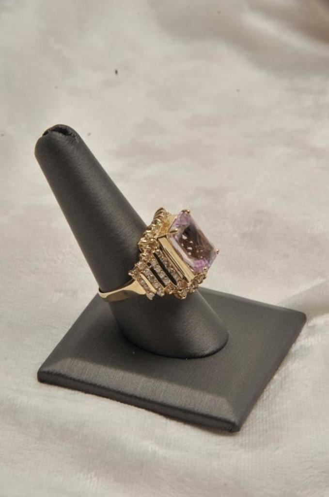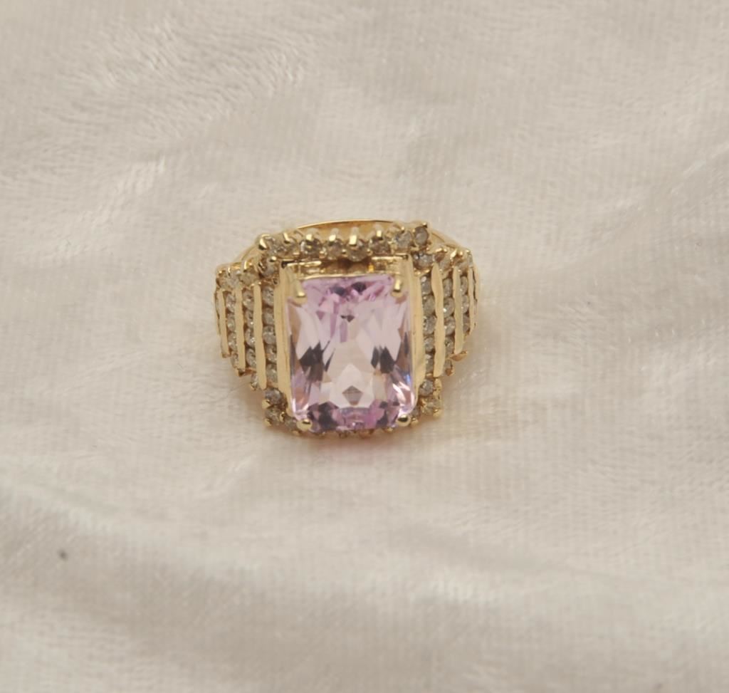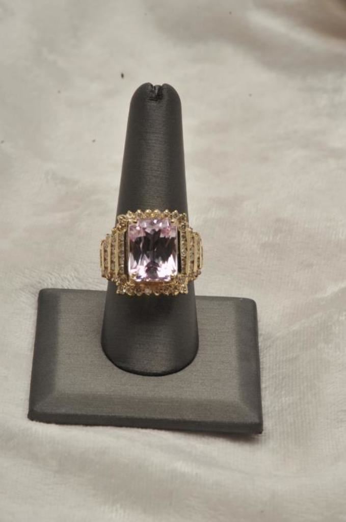 One ladies ring in 14k yellow gold set with a fine pink kunzite weighing approx. 7 cts and has 32 surrounding diamonds weighing approx 0.60ct Est:$1500-3000