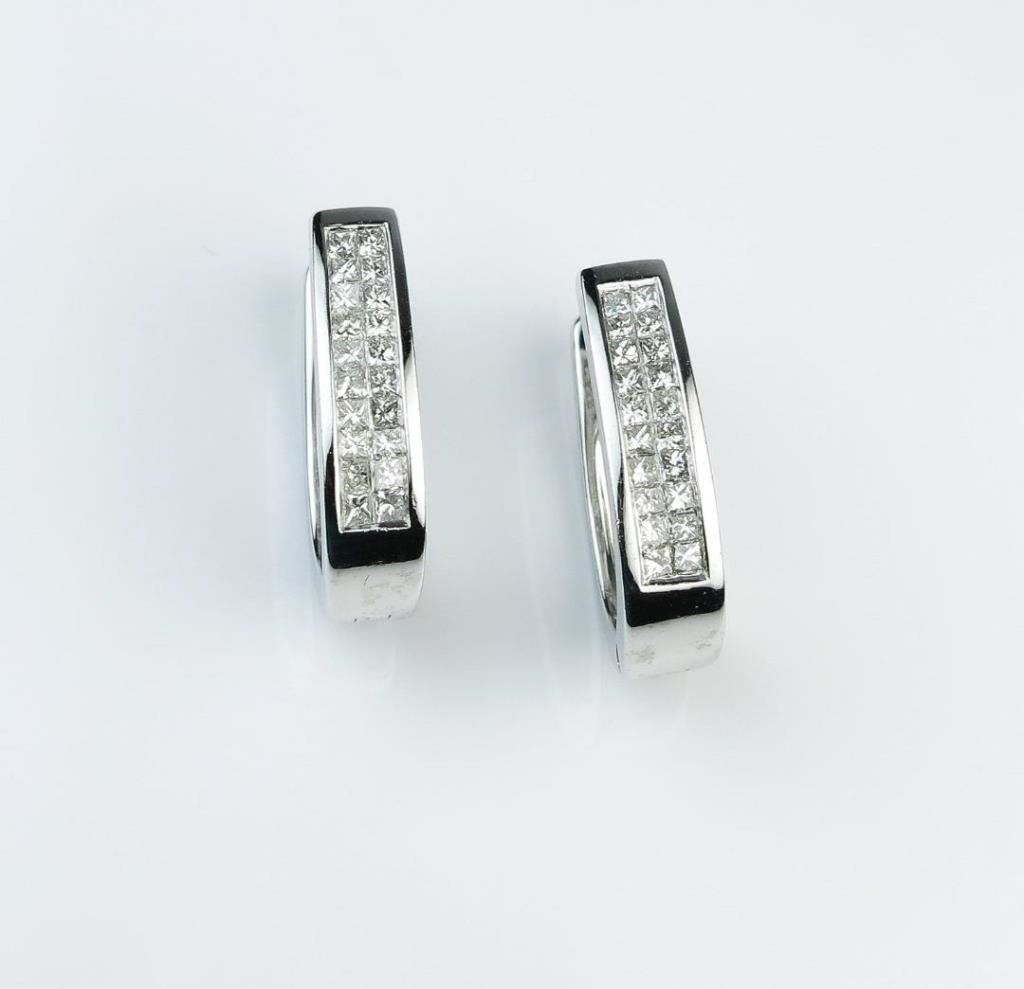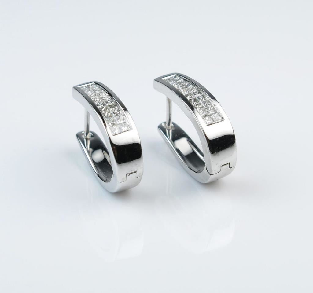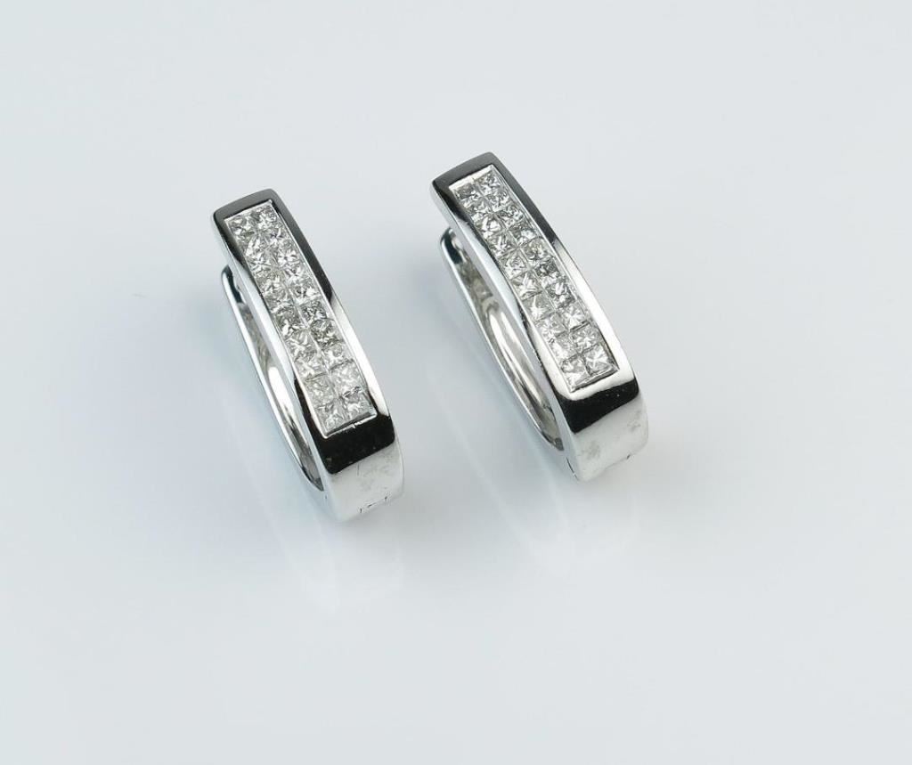 Extra Fine Contemporary Princess cut Diamond Earrings featuring 40 princess cut Diamonds weighing approx. 1.20 carats total with F-G colors and VVS/VS clarity invisible set in 14 karat white gold settings. Retail $3,000-$4,000 Estimates $1,500-$2,000