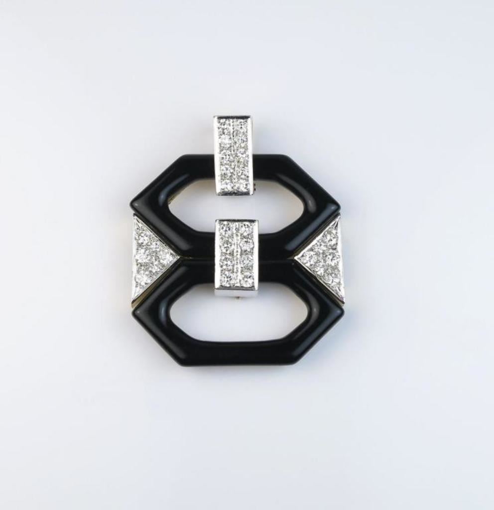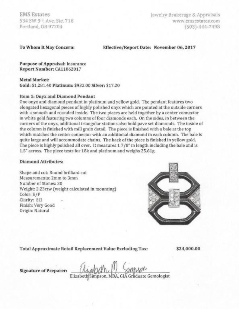 Exquisite Platinum and 18 karat Gold Black Onyx and Diamond Pendant featuring 2 pieces of carved Onyx accented with 30 pave set Diamonds weighing approx. 2.23 carats with E-F colors and SI clarity. See Full Appraisal - Valued at $24,000.00 Estimates $4,000-$6,000