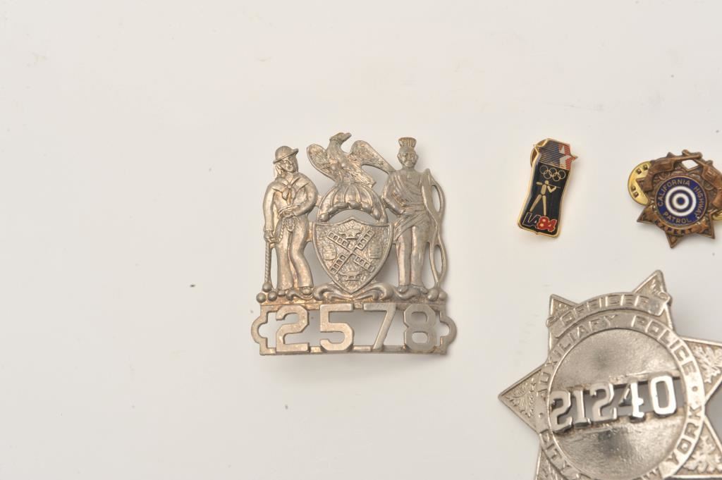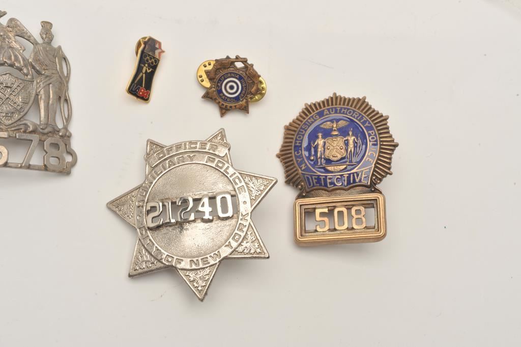 Lot of 3 cap badges including a Fire Dept. badge (2578), an N.Y.C. Housing Authority Police Detective badge (508) and a City of New York Auxiliary Police badge (21240); also two commemorative pins one for the 1984 Olympic shooting competition and a Calif. Hwy Patrol Expert shooting pin. Est.: $150-$300.