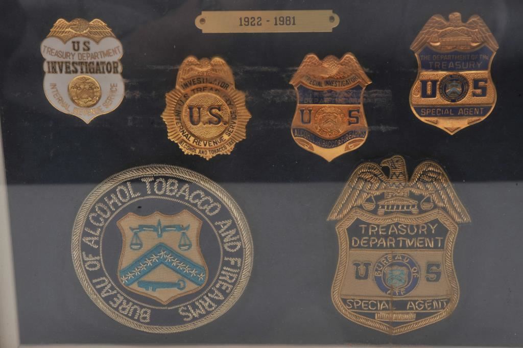 Framed display of 4 badges and two patches with brass label “1922-1981” showing different styles for the U.S. Treasury Dept./A.T.F. Est.: $200-$400.