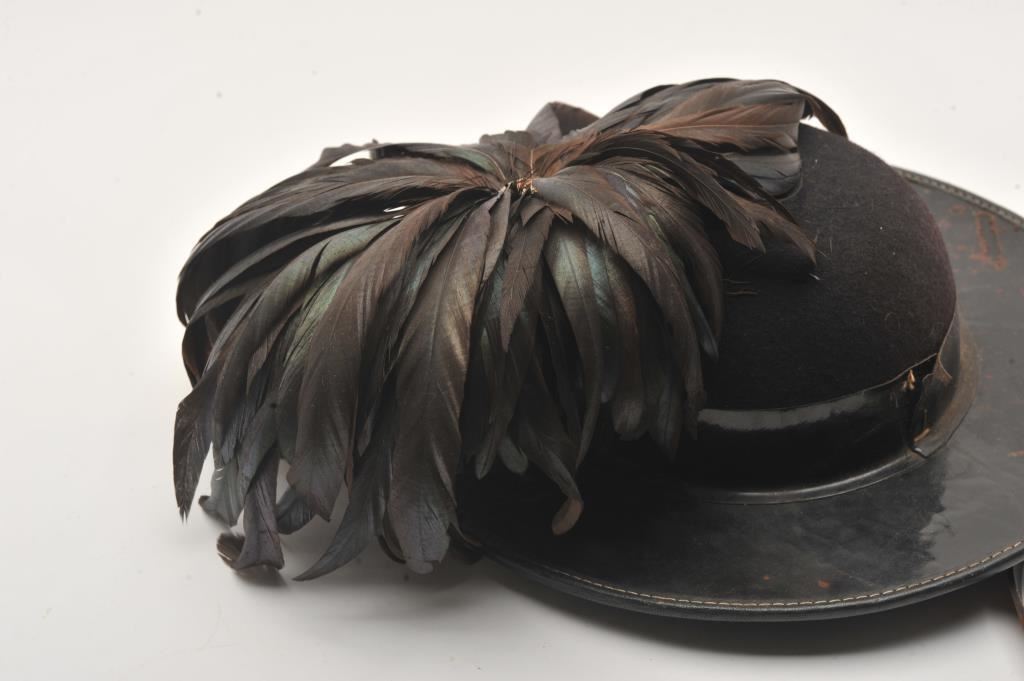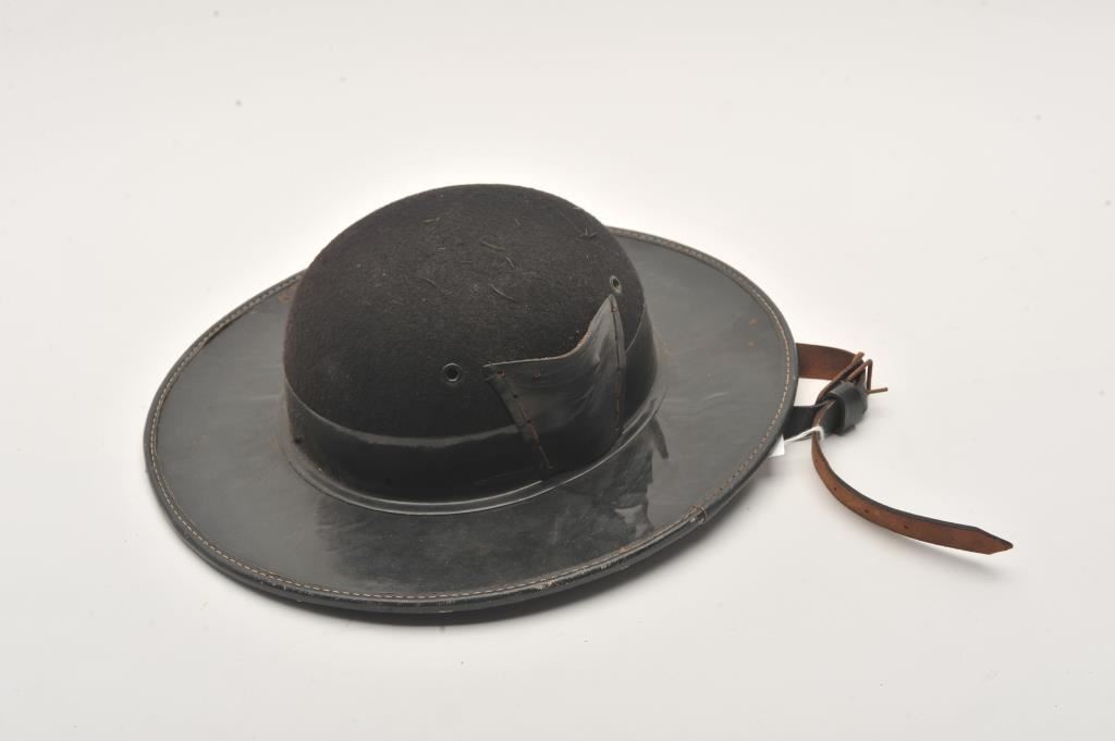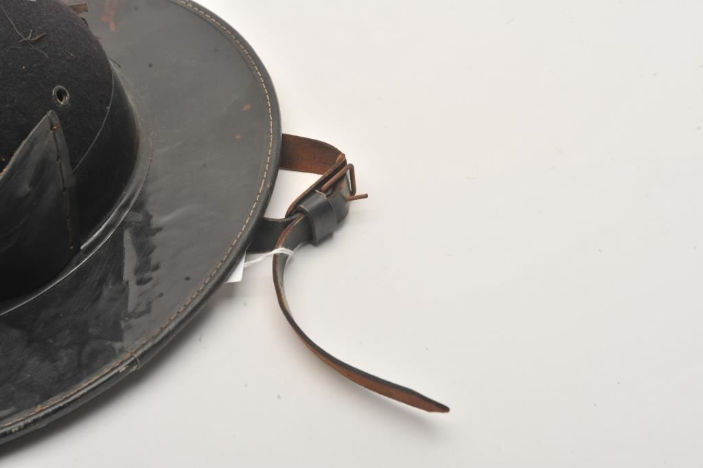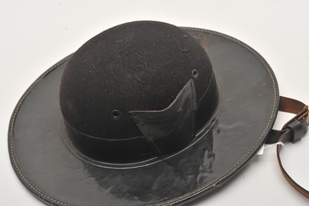 WWII vintage Italian Bersiglier hat used and worn by Italian Special Forces. Size 54.Good condition. Minor leather wear and small losses. With strap. Only example we have seen in decades. Est.: $175-350