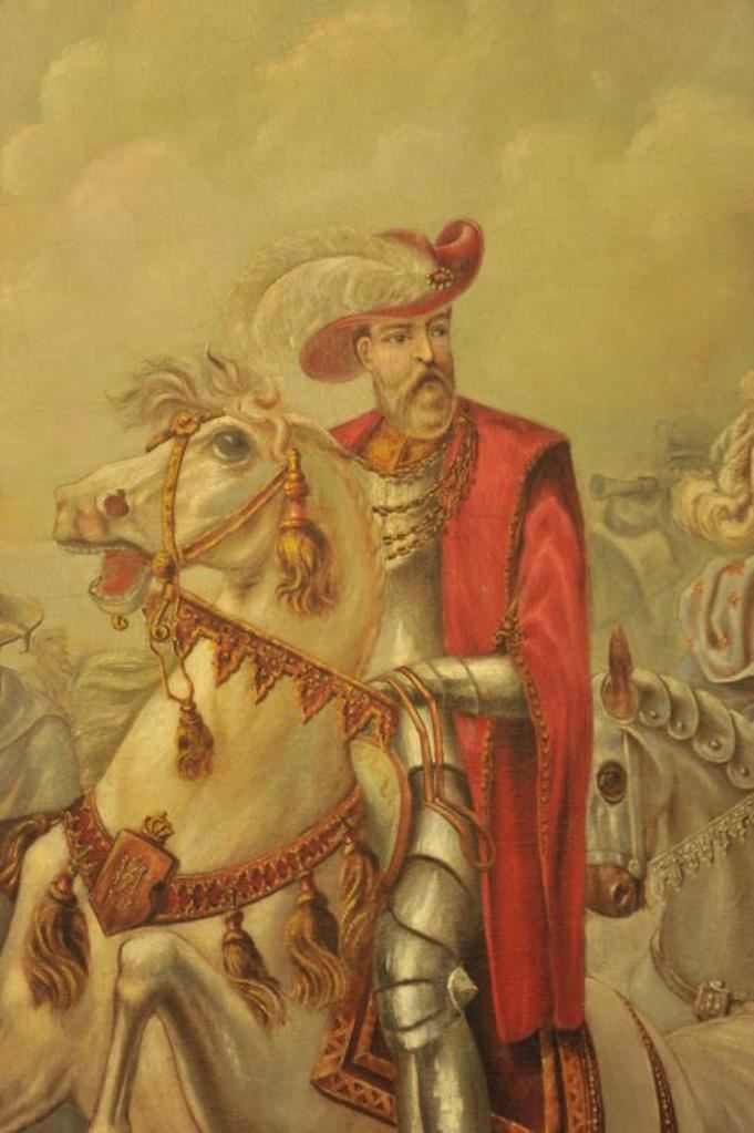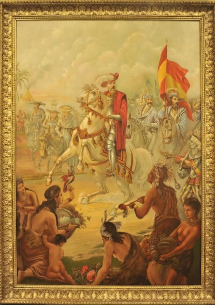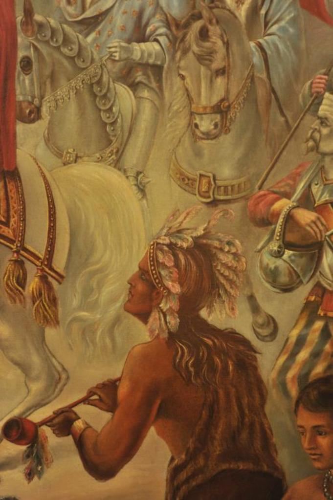 Unsigned oil painting on canvas attributed to William Henry Powell, possibly a study preceeding for a major work entitled "Desoto Discovering the Mississippi" which is displayed in the Capitol Rotunda in Washington DC, and regarded as a National Treasure. Believed to be painted by William Henry Powell while in Spain or France circa 1850 preceeding his monumental size work. Back of painting is inscribed with note: "Scott; please remember that the painting is an attribution based upon all the best evidence available and its origin with the founder of Walker Museum in Minn signed SMK" Impressive and a fine work of master quality. 70" x 52", well framed and recently cleaned and restored to excellent condition. Also, notation on frame reads "study for 'Desoto Discovering Mississippi" - Prov. Thomas Barlow Walker founder of the Walker Museum. Est. $15,000-30,000