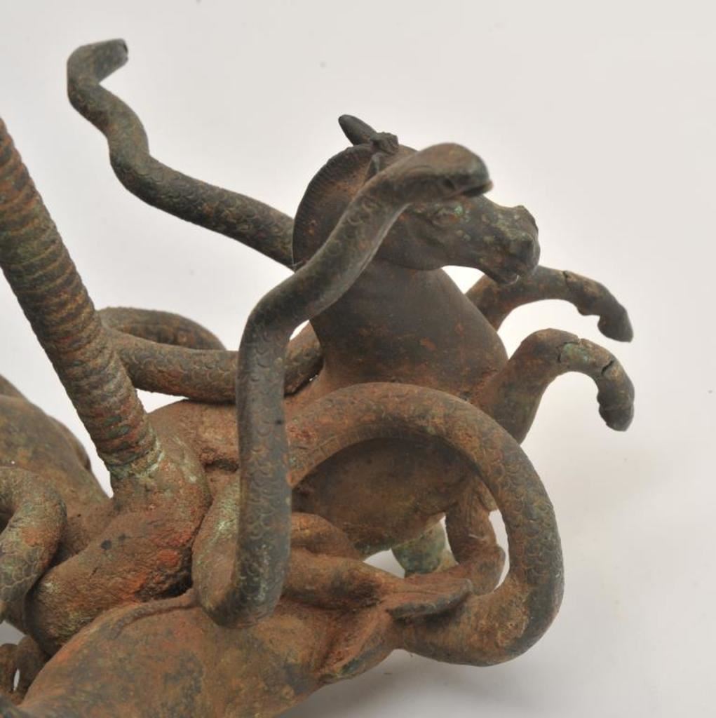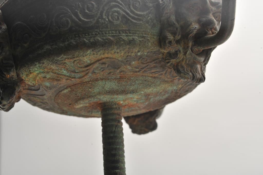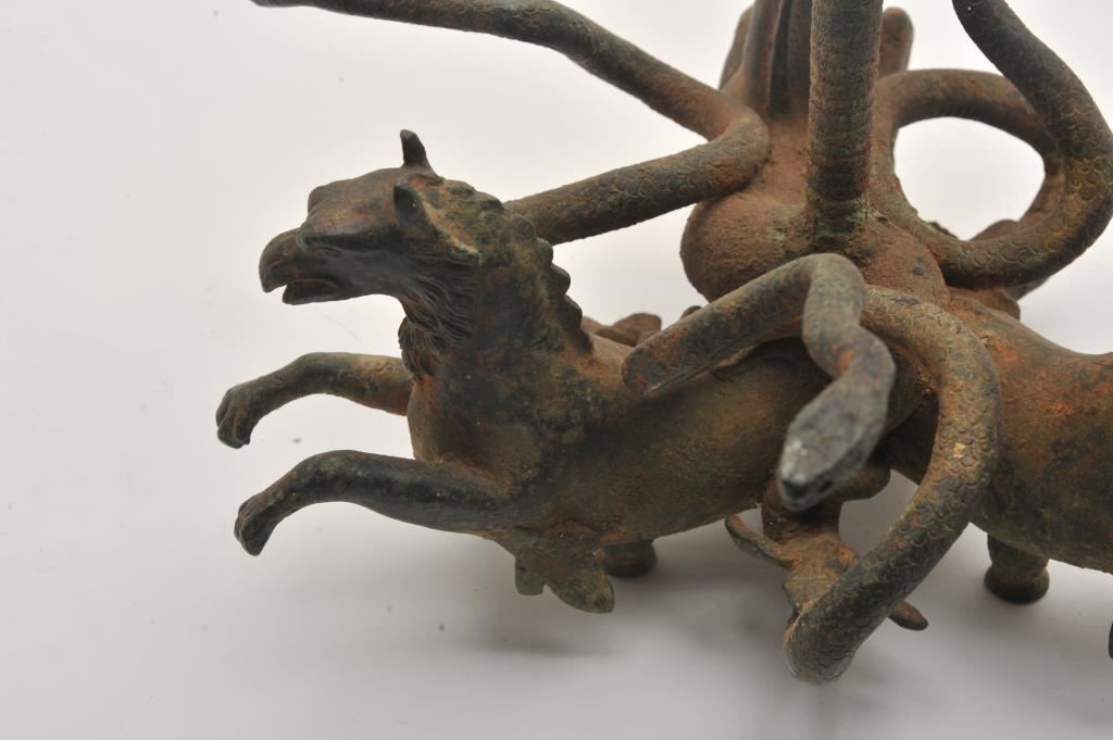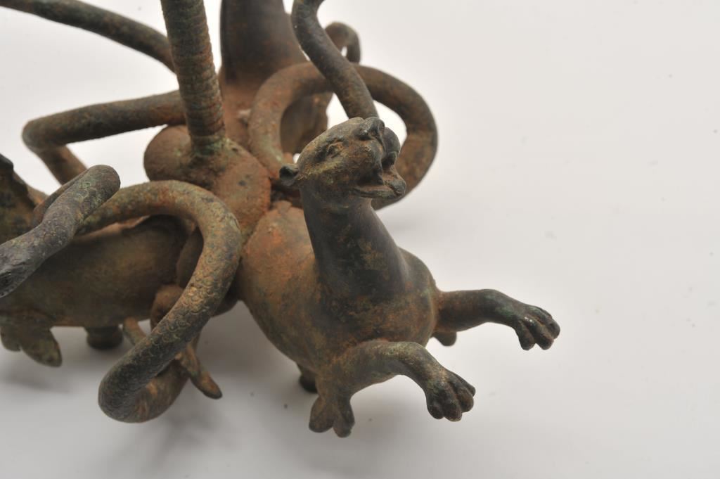 Ancient Roman bronze oil lamp of palace size circa 400 BC-200 AD. approx. Bowl shows 3 heads with serpants issuing from mouths. Fancy base with horses and beasts entangled by serpants. Shows old well done repair to ends of serpent (tongues) and other small areas of restoration. From the estate of prominent antique collector Eric Vaule, who valued it at $35,000 retail. From his vault. Est. $10,000-20,000