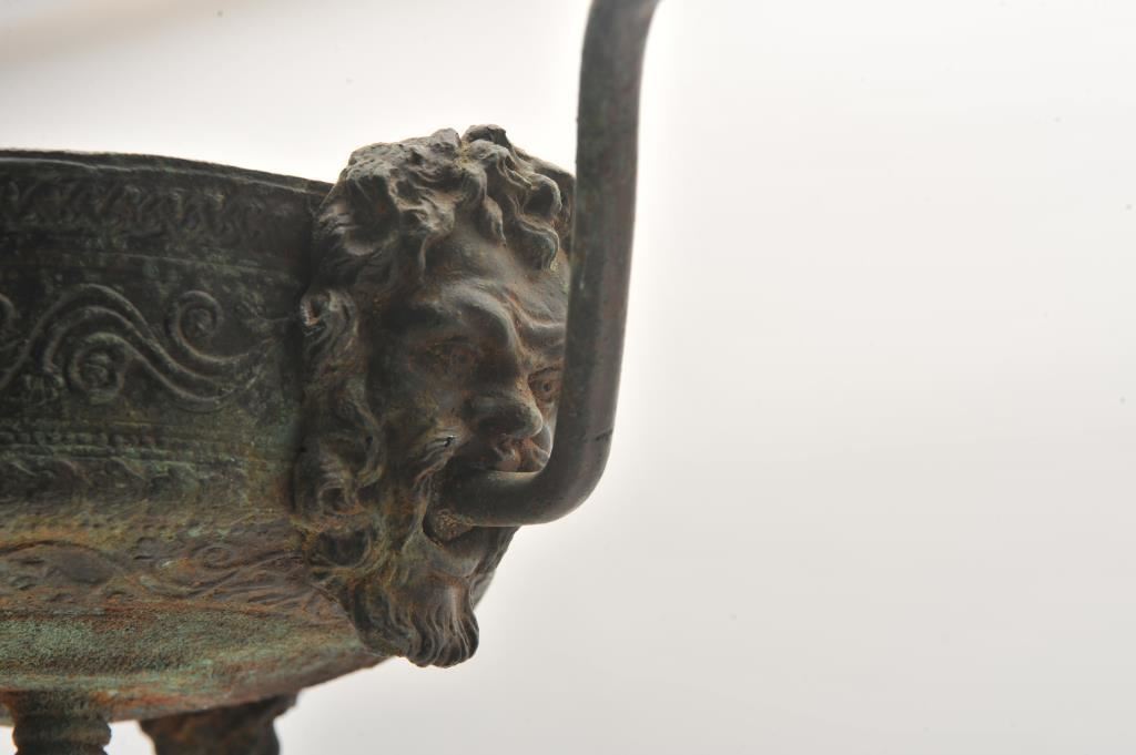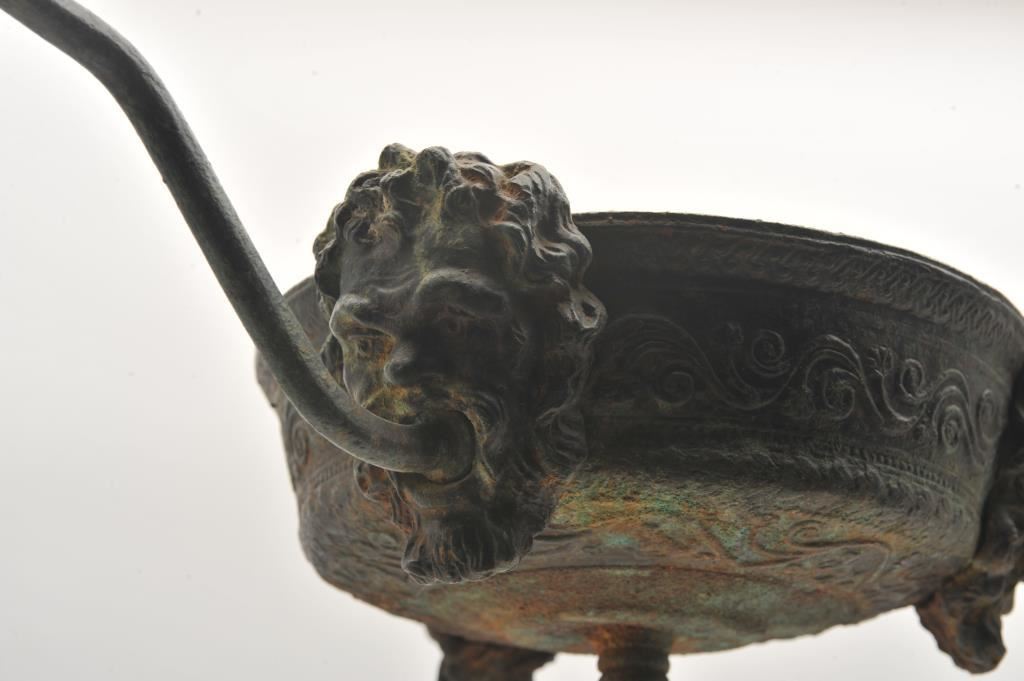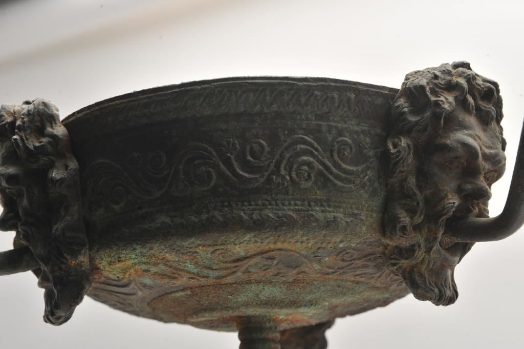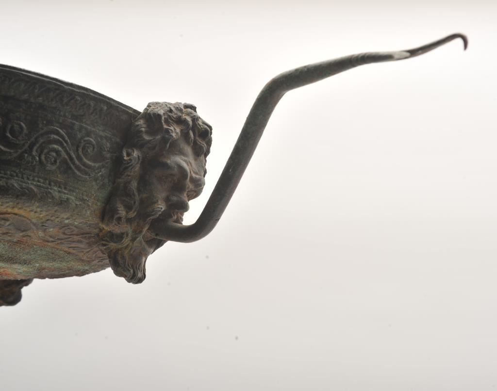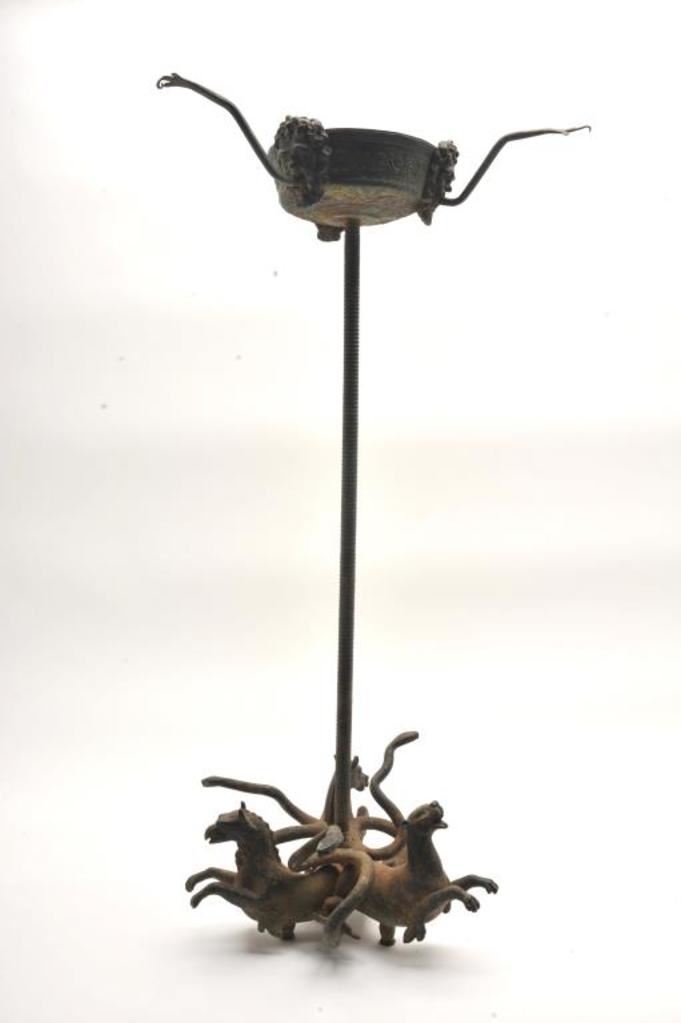 Ancient Roman bronze oil lamp of palace size circa 400 BC-200 AD. approx. Bowl shows 3 heads with serpants issuing from mouths. Fancy base with horses and beasts entangled by serpants. Shows old well done repair to ends of serpent (tongues) and other small areas of restoration. From the estate of prominent antique collector Eric Vaule, who valued it at $35,000 retail. From his vault. Est. $10,000-20,000