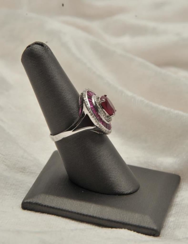One traditional ruby ring in 18k white gold set with an oval Burmese ruby weighing approx 2.75 ct. , ruby baguettes and diamonds Est:$7500-15000