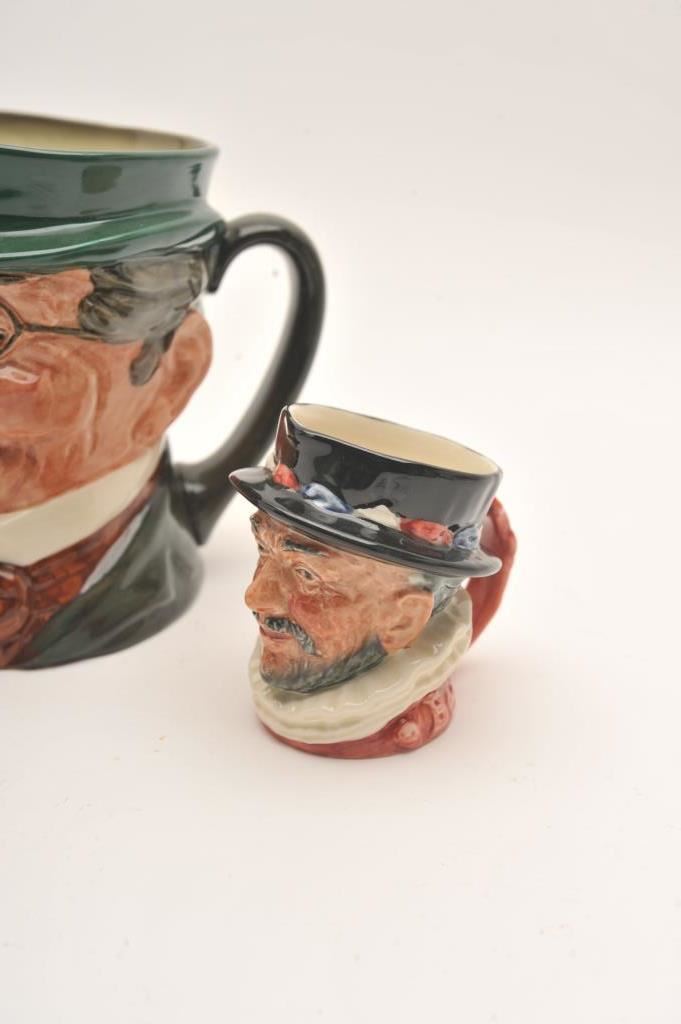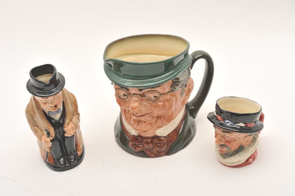 Lot of 3 Royal Dalton Toby mugs. Pickwick large size, 5 1/2" ht, Winston Churchill, 5 1/2" ht, Beefeater, 3" ht; 2 show a letter with green Royal Dalton marking. Winston Churchill shows name and mark with no "A". Est. $150-300