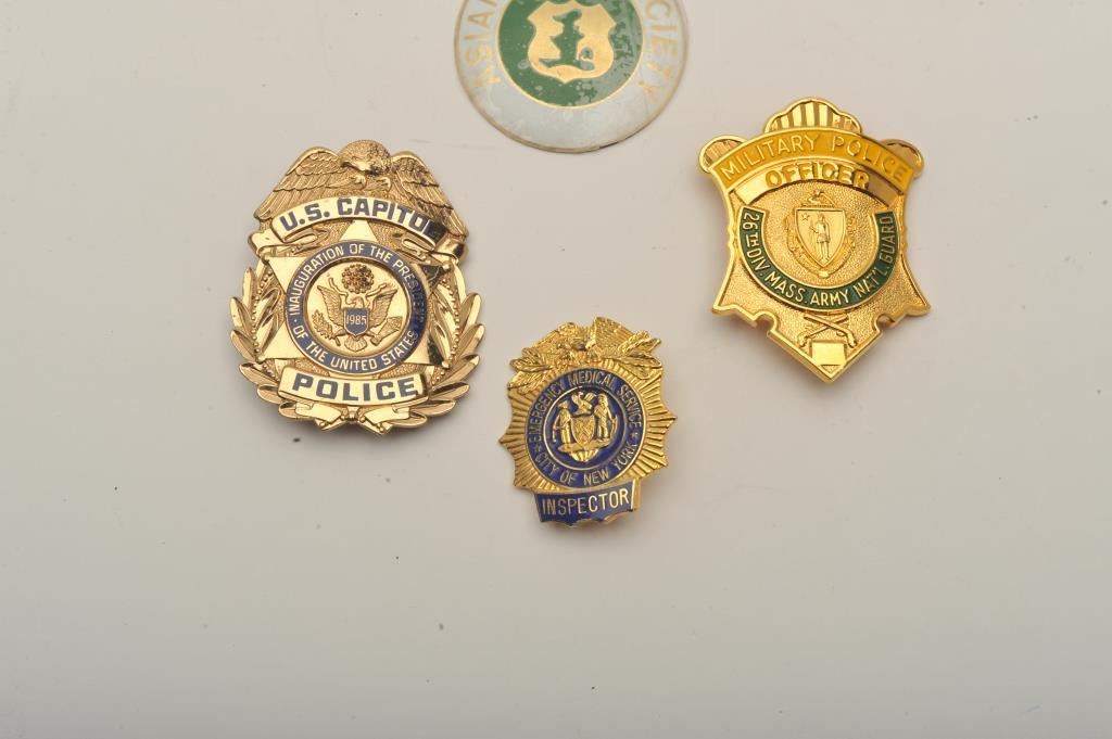 Misc. lot of 5 pieces including a U.S. Capital Police Inauguration of the President 1985 pin shield badge (hallmark Blackinton and #1291), a Military Police Officer 26th Division Mass. Army Nat’l Guard pin shield badge (hallmark Blackinton), a small City of New York Emergency Medical Service Inspector pin shield badge, another small City of New York Emergency Medical Service pin badge and a small round metal Asian Jade Society disc. Est.: $150-$300.
