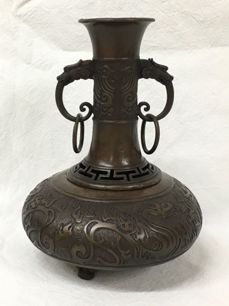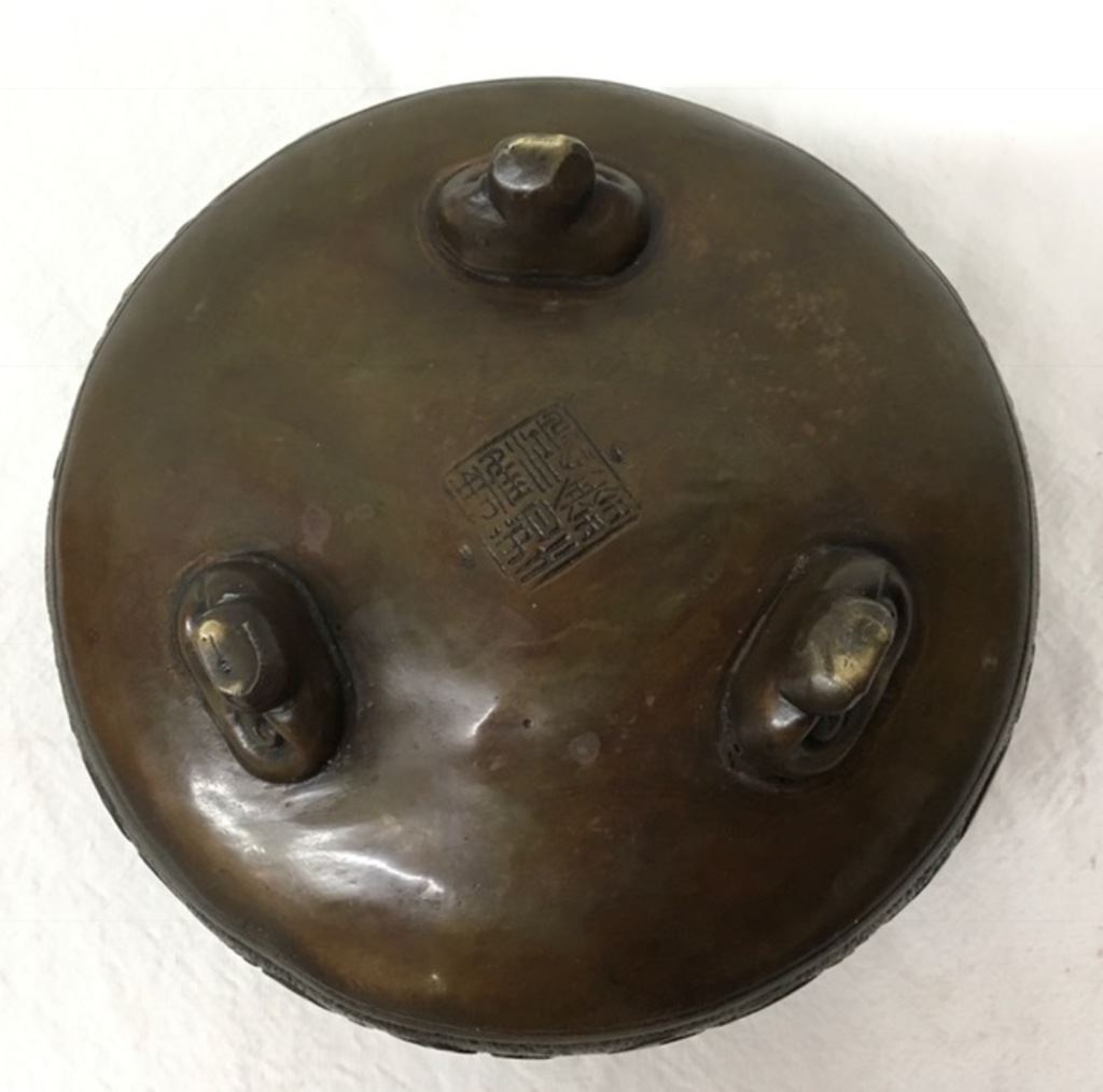 Oriental Bronze Incense Burner with Dragon mounts holding rings. 9 1/2” X 7”Estimate $200-$300